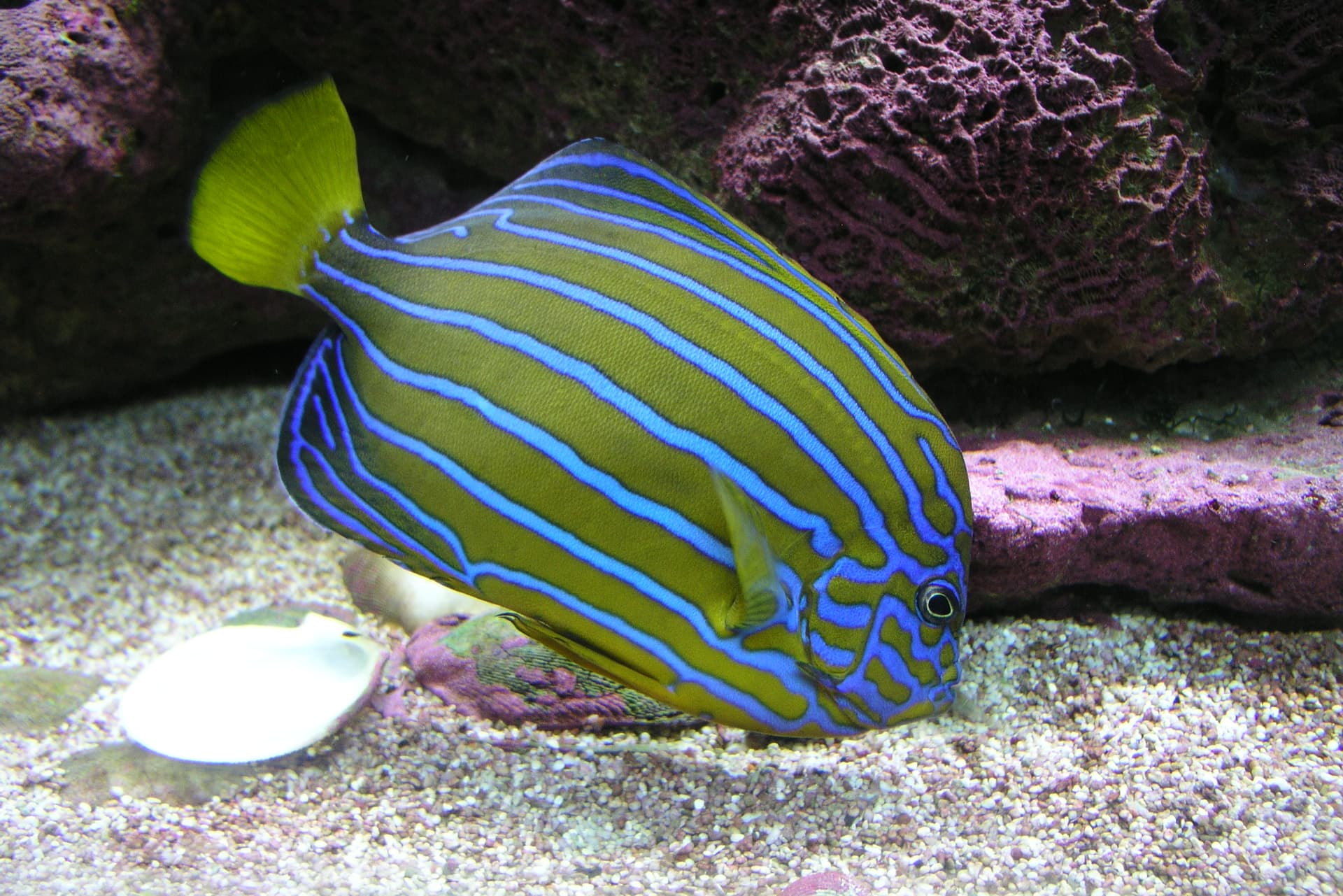 - The adult body is a vibrant yellowish-tan or brown-orange, covered in 7 to 8 striking, horizontal electric blue lines that converge toward the base of the tail. The large dorsal and anal fins are darker and feature thicker blue lines that can create maze-like or arabesque patterns. The tail (caudal fin) is a luminous, bright yellow.