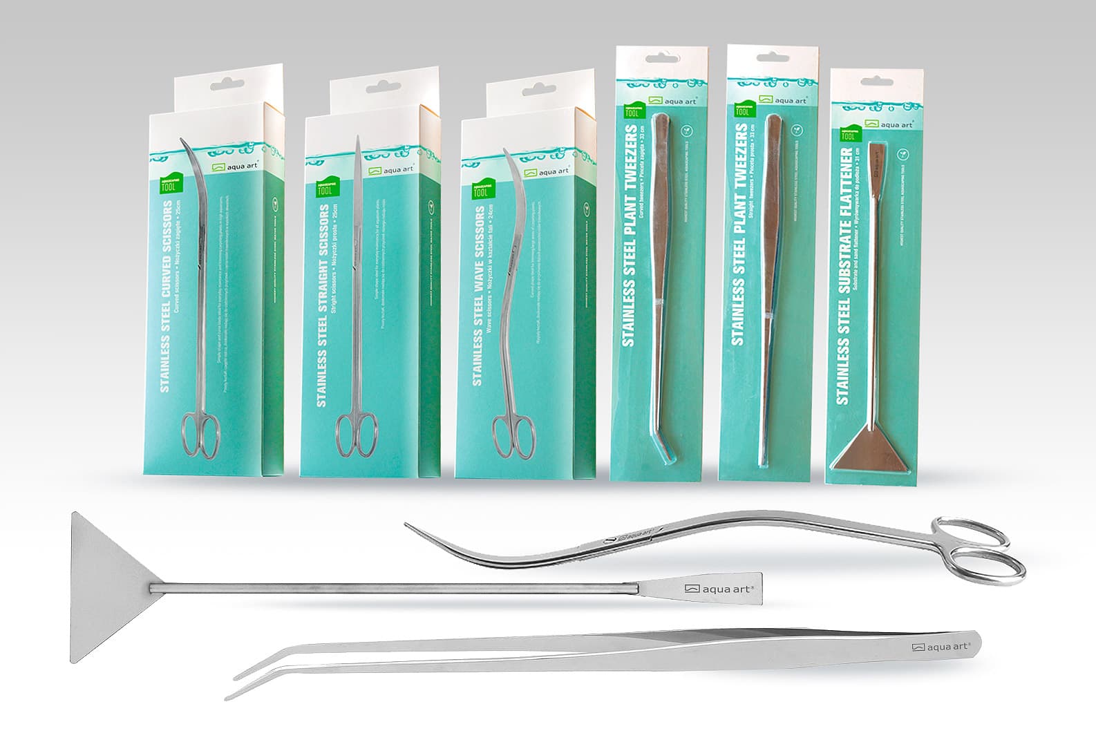 - Aquarienwerkzeuge wie Pinzetten, Scheren und Glätteisen in verschiedenen Modellen