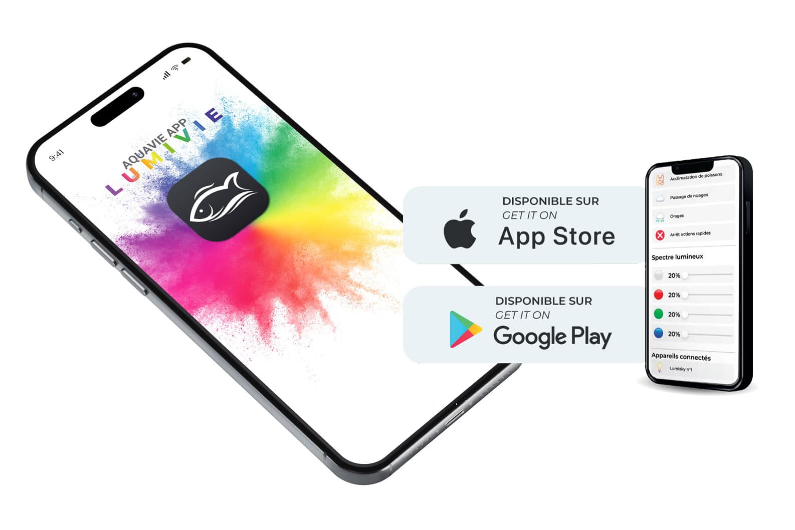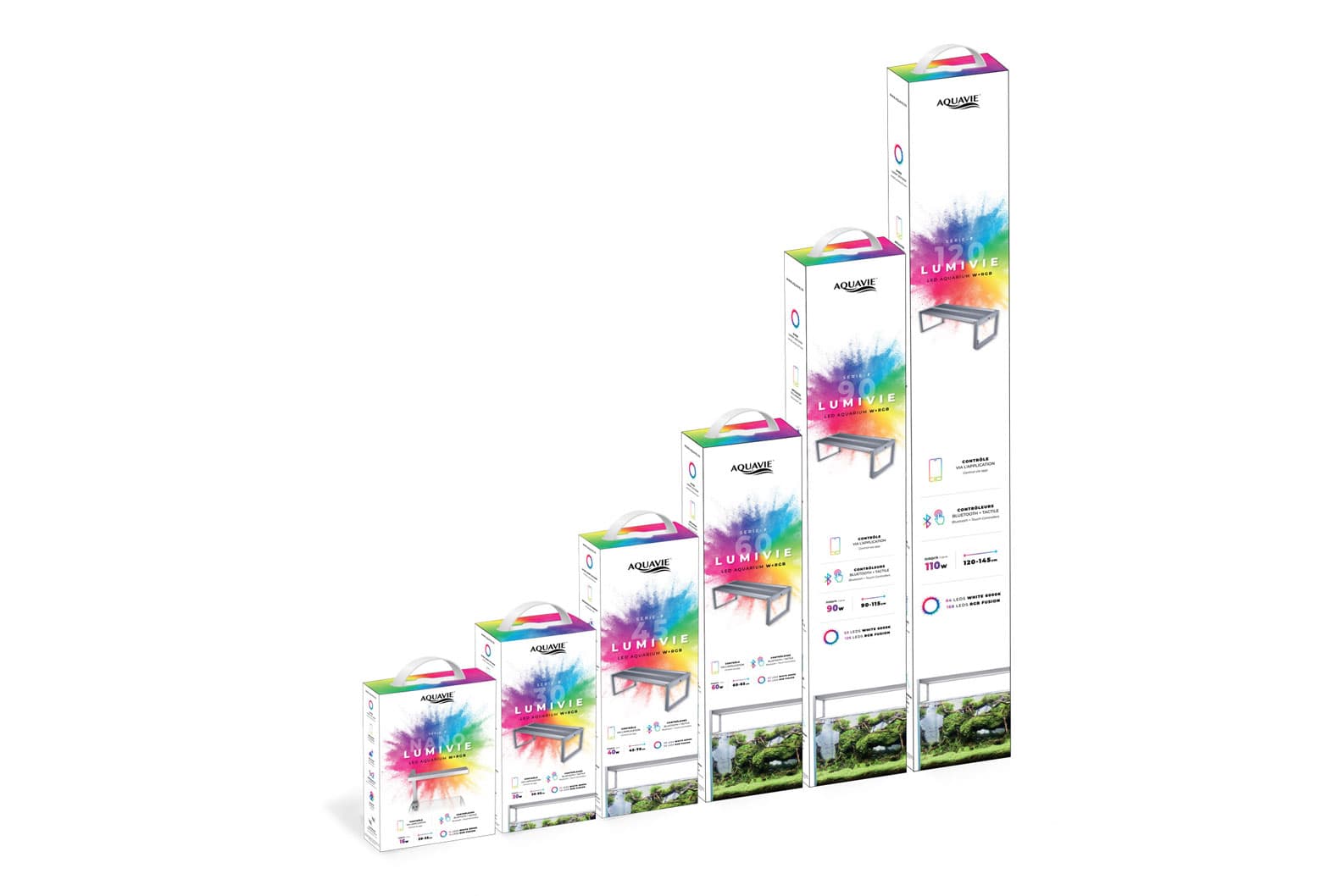 Über die Aquavie iOS/Android™ App steuerbar, simulieren sie Sonnenaufgang, Sonnenuntergang und Wetterbedingungen, fördern das Pflanzenwachstum und das Wohlbefinden der Fische. Kompakt und intuitiv werten sie das Aquarium optisch auf.