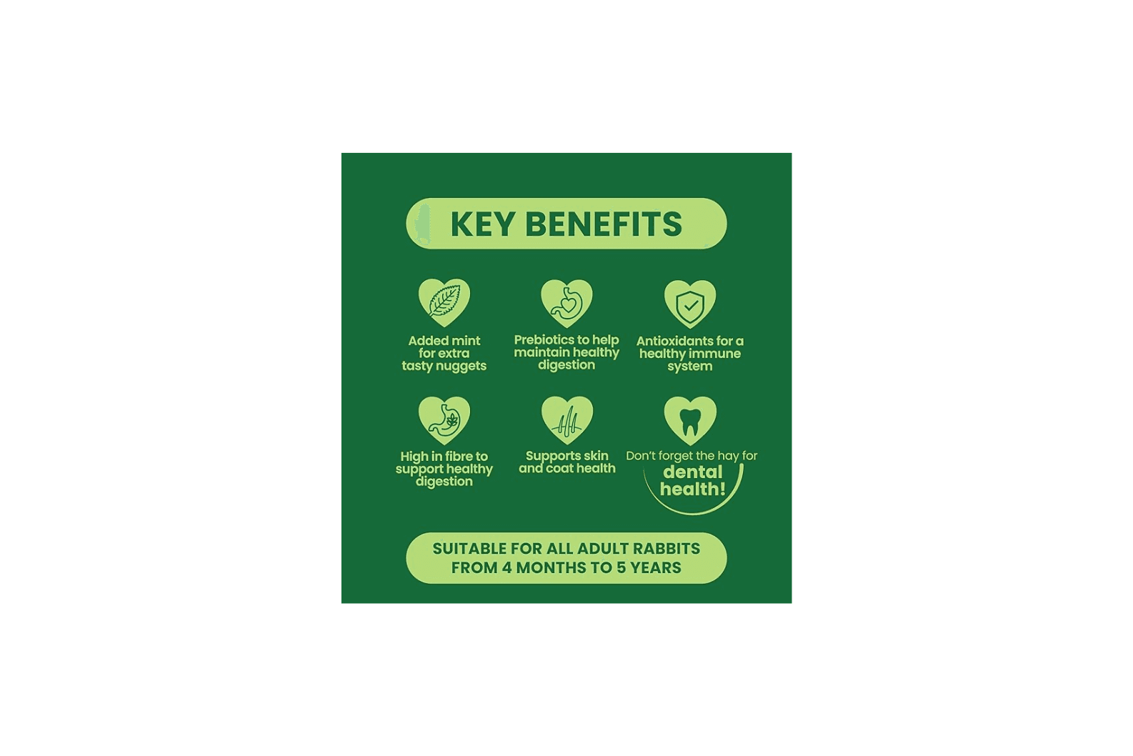 Unsere köstlichen, ballaststoffreichen Kaninchen Nuggets mit Minze ergänzen die Ernährung deiner Kaninchen mit Vitaminen und Mineralien und verhindern selektive Fütterung. Geeignet für ausgewachsene Kaninchen ab 16 Wochen.