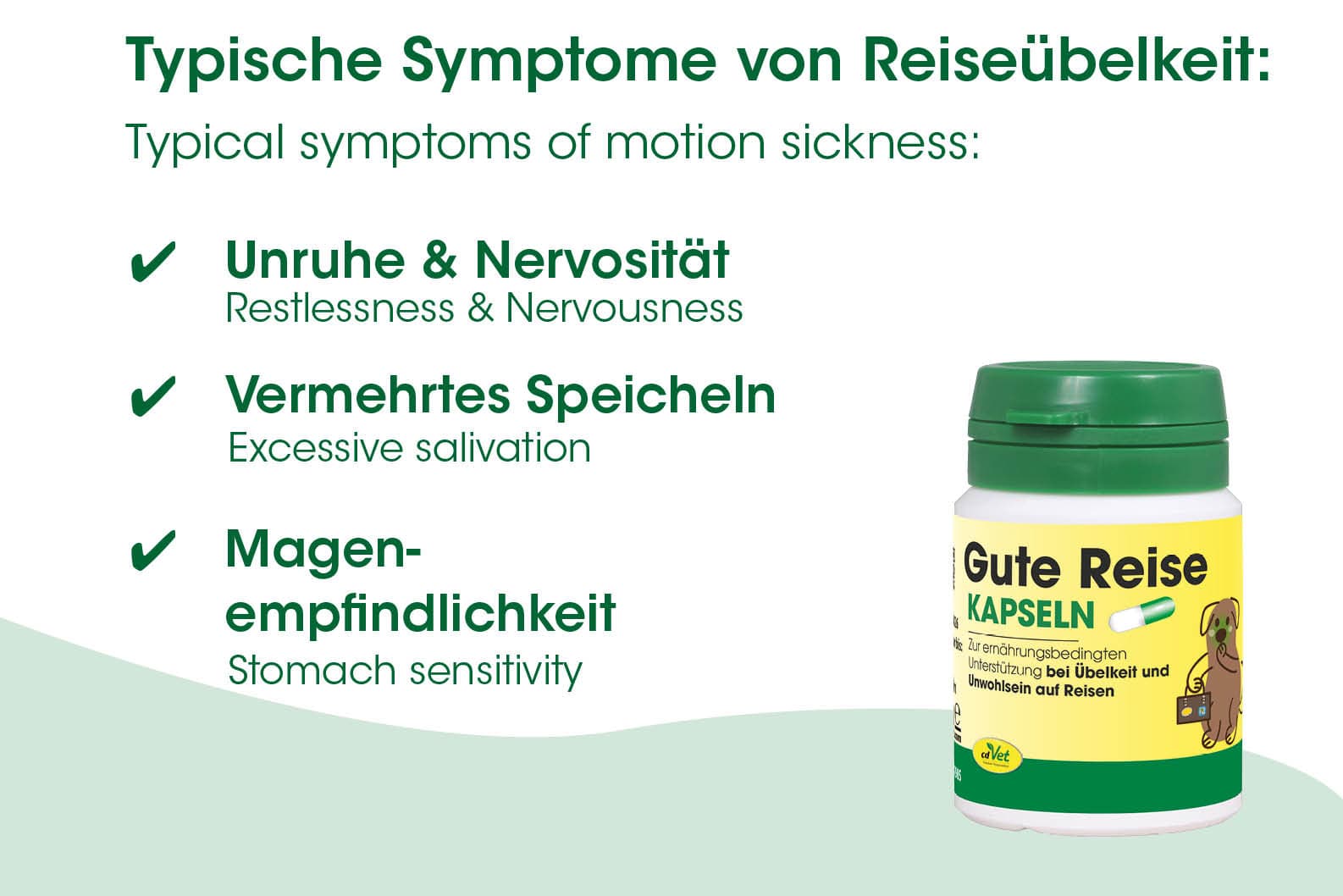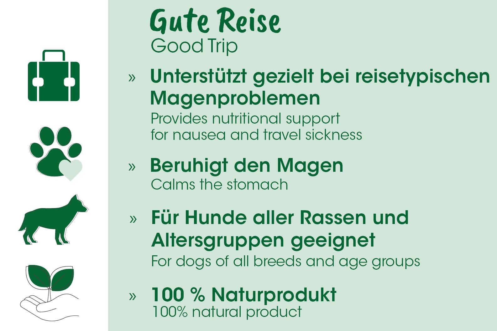Unser natürliches Gute Reise gegen Reiseübelkeit wurde speziell für Hunde entwickelt, die unter den typischen Symptomen wie Nervosität, Speicheln oder Magenbeschwerden leiden. Die fein abgestimmte Mischung aus bewährten Pflanzenstoffen unterstützt Magen und Nerven Deines Vierbeiners – sanft, gut verträglich und ganz ohne künstliche Zusätze.