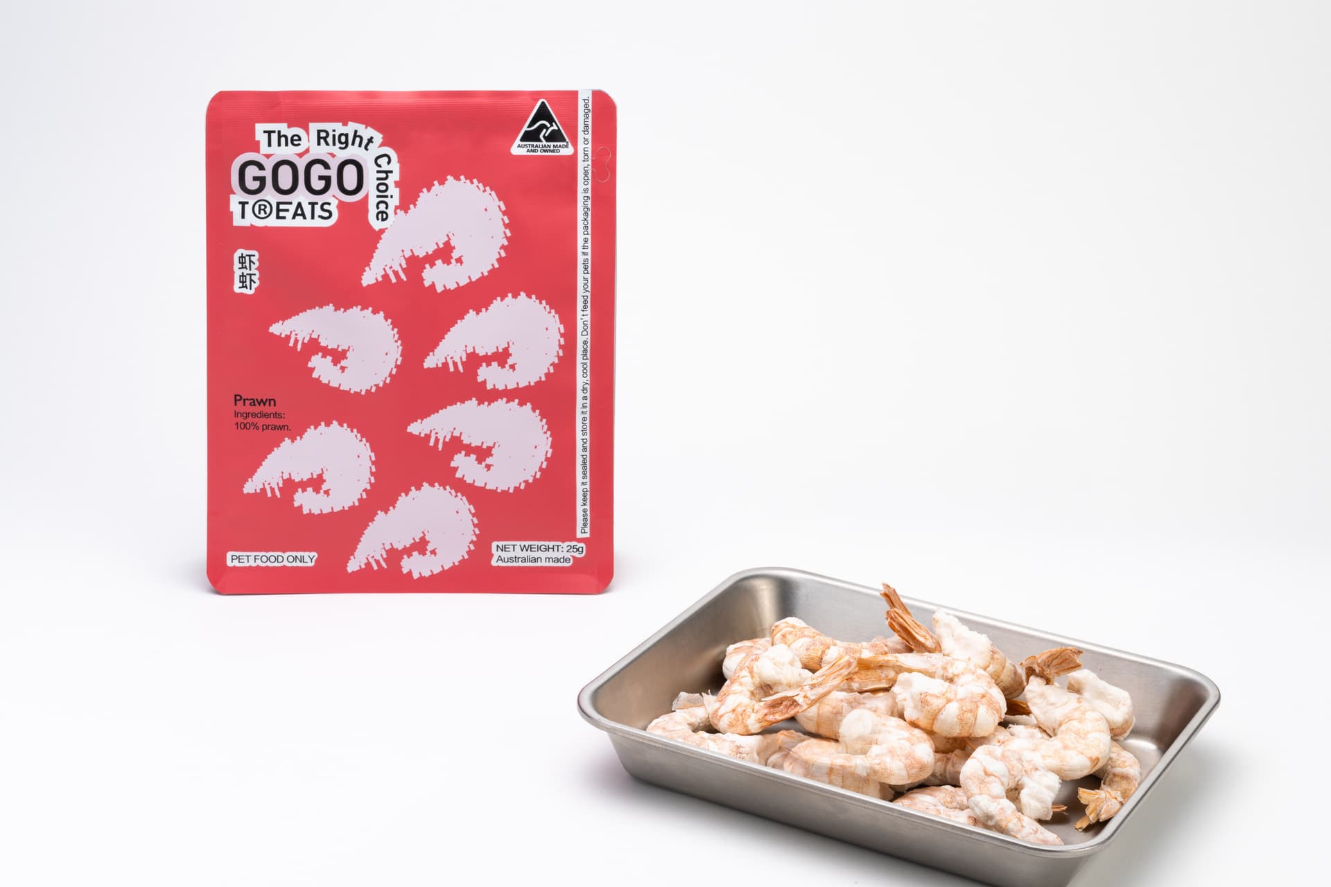 Gogo Treats Gefriergetrocknete Garnelen bestehen aus einer einzigen Zutat: 100% australische Garnelen. Jede Packung enthält 8–10 ganze Garnelen, gefriergetrocknet in unserer Anlage in Melbourne — natürlicher Geschmack, Protein und Nährstoffe vollständig erhalten.