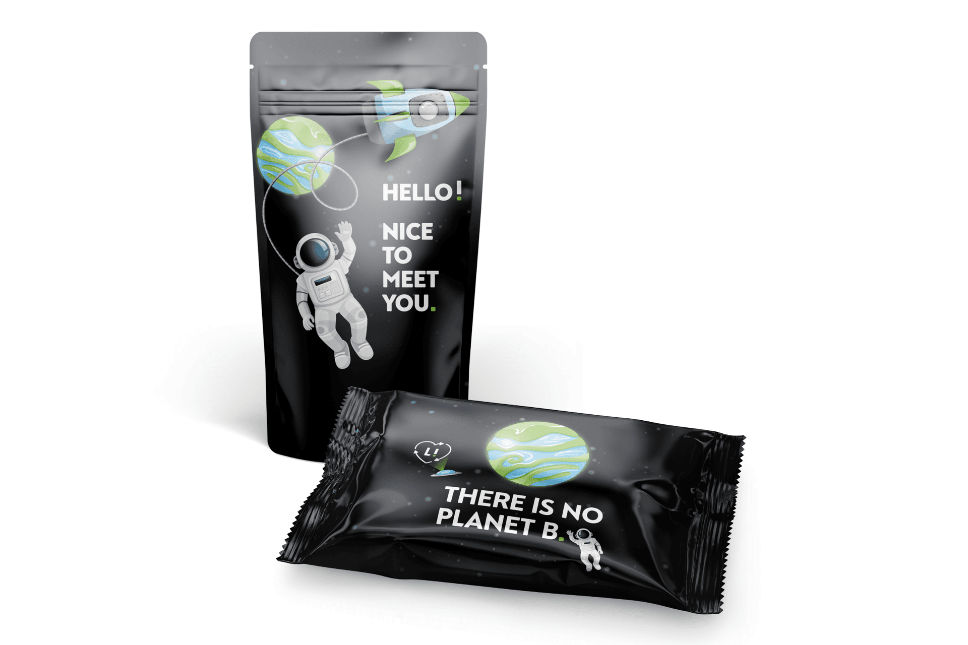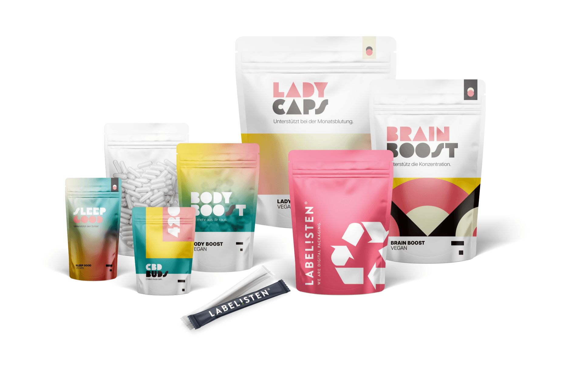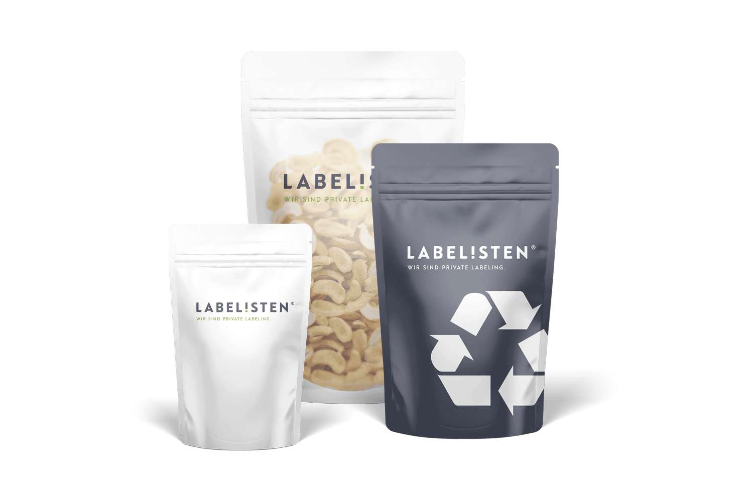 Standbodenbeutel aus recycelbaren Monomaterialien in metallic, weiß und transparent vollflächig bedruckt lassen deine Produkte aus der Masse hervorstechen!
