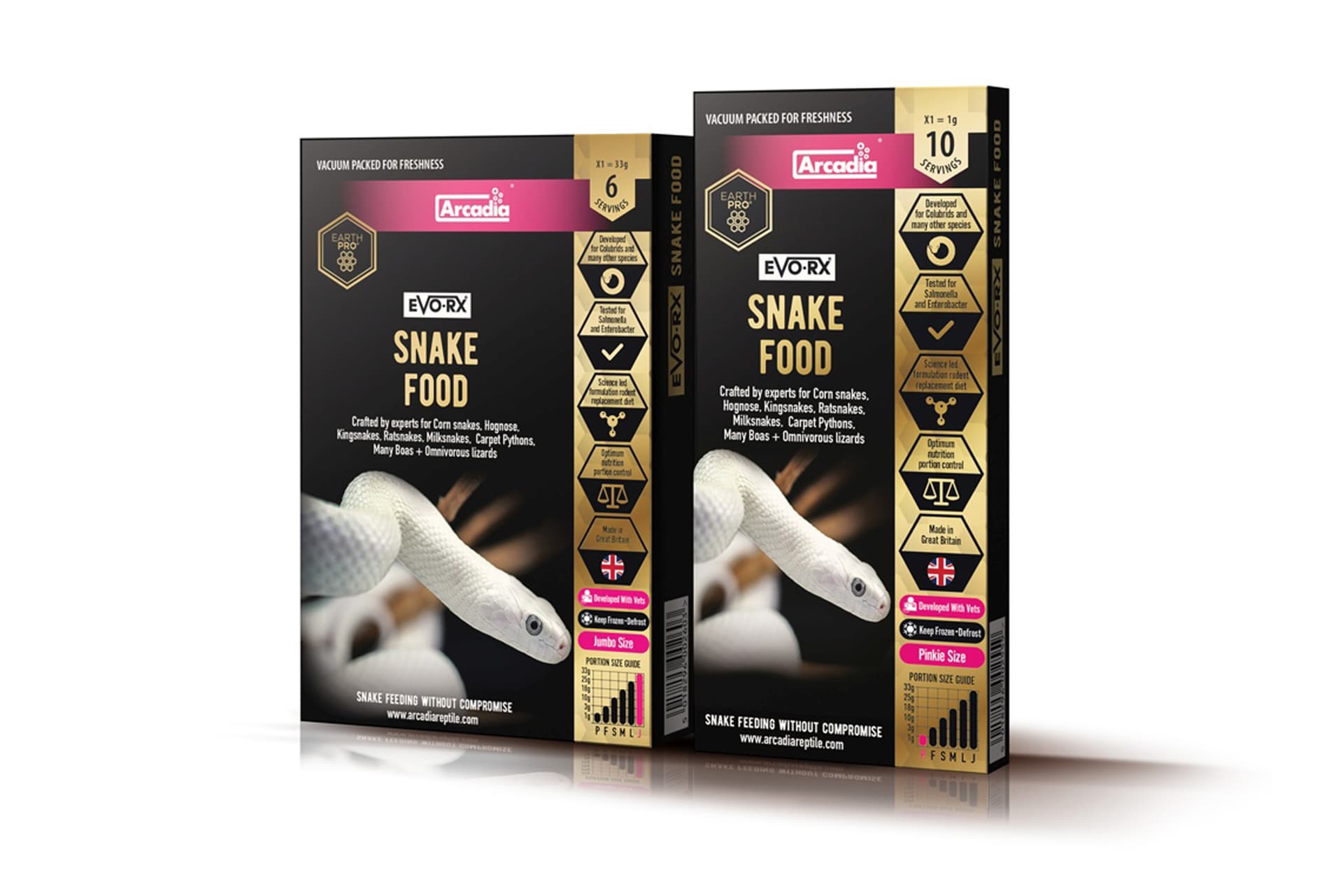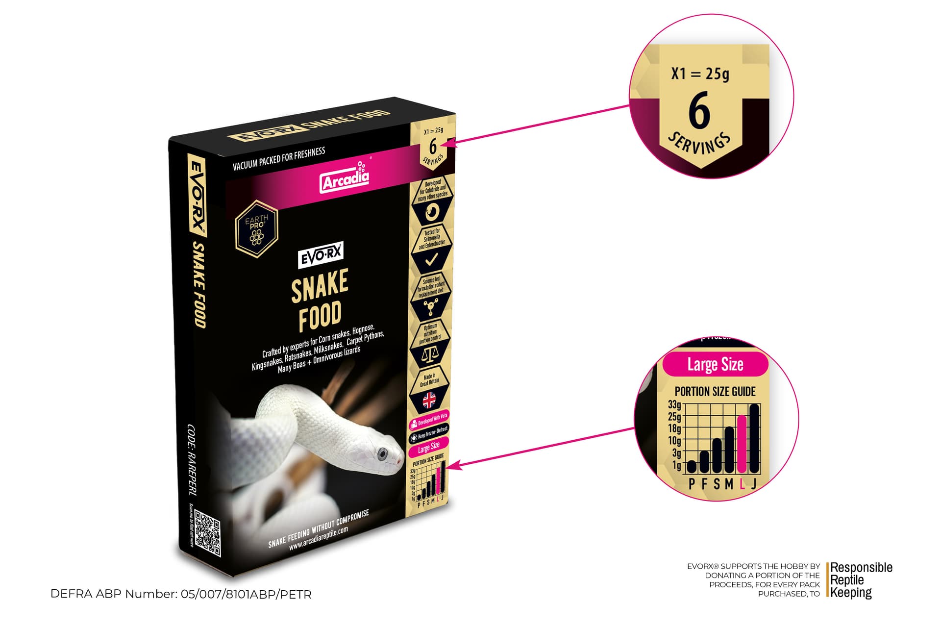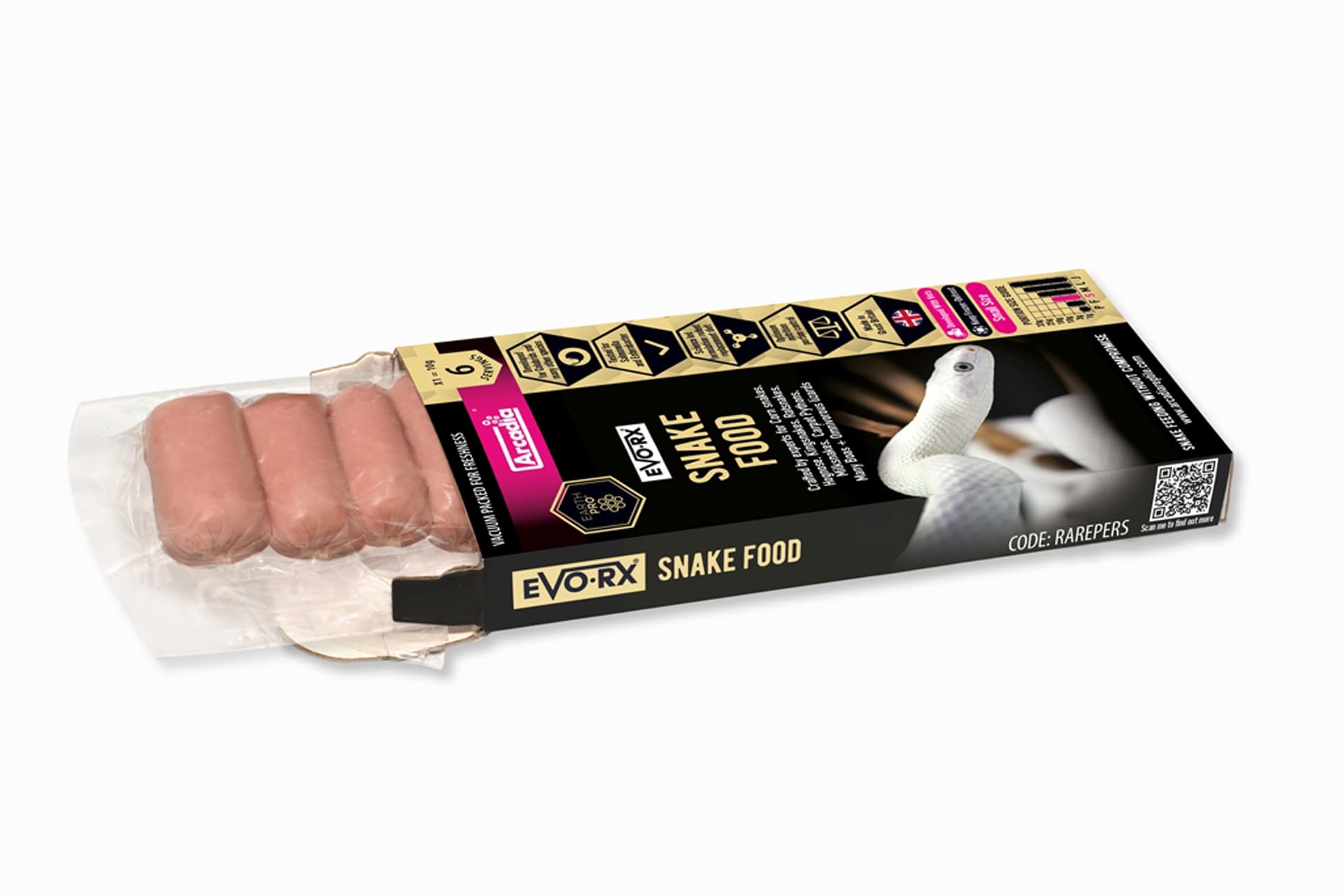 EvoRx® ist ein neues Tiefkühlfutter für Schlangen und andere fleischfressende sowie allesfressende Reptilien von Arcadia. Jedes wurstförmige Futterpaket wird nach standardisierten Spezifikationen gewogen – anstatt auf ungefähre Größen zu setzen – um Unsicherheiten beim Füttern zu eliminieren und eine gleichbleibende Ernährung bei jeder Fütterung sicherzustellen. Das Nährstoffprofil enthält mageres Protein, das die unnötige Fettaufnahme reguliert, das Risiko von Fettleibigkeit reduziert und gleichzeitig gesundes Wachstum unterstützt.
