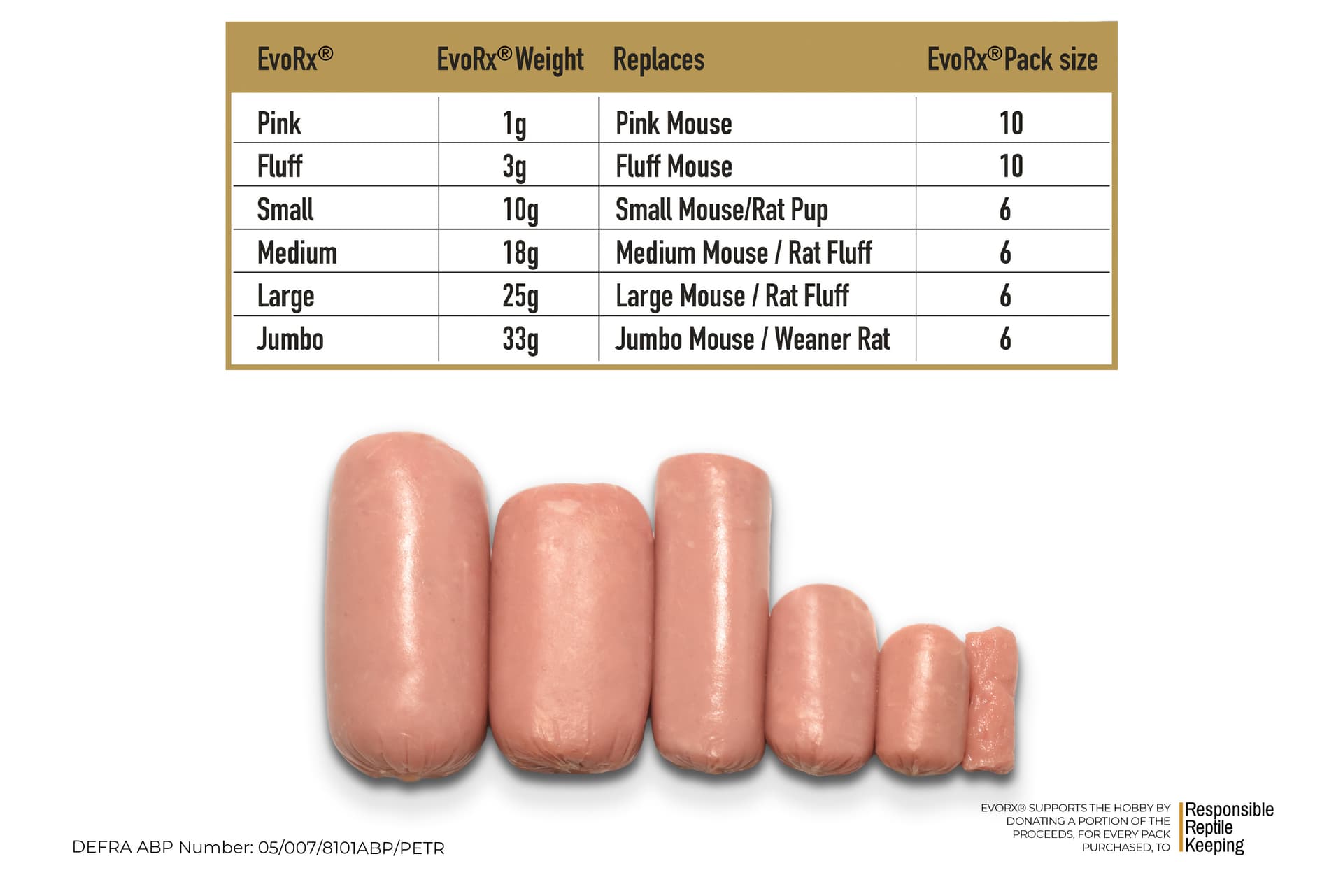 - Erhältlich in 6 Gewichtsklassen, die die am häufigsten gefütterten Nager widerspiegeln. EvoRx® wird nach Gewicht standardisiert, nicht nach Größe, sodass Halter die Portionsgrößen kontrollieren und das Risiko von Fettleibigkeit reduzieren können