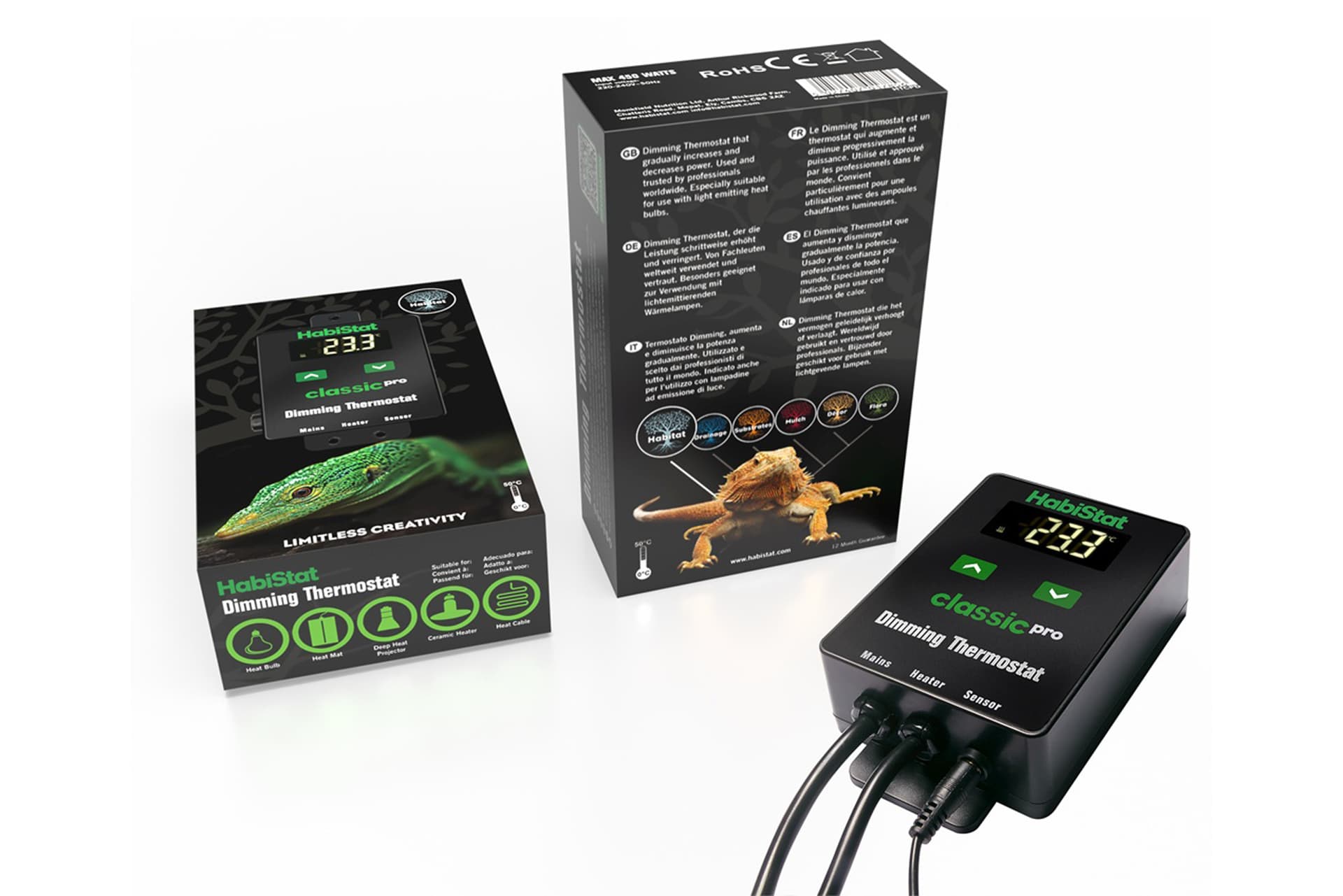 Das HabiStat Classic Pro Thermostat-Sortiment bietet drei zuverlässige, einfach zu bevorratende Lösungen, die alle wichtigen Wärmequellentypen abdecken – ein übersichtliches Sortiment, das Händler mit Überzeugung empfehlen können. Alle drei Modelle haben eine maximale Last von 450 Watt, werden seit Jahrzehnten von Haltern geschätzt und verzeichnen einen konstanten Abverkauf.