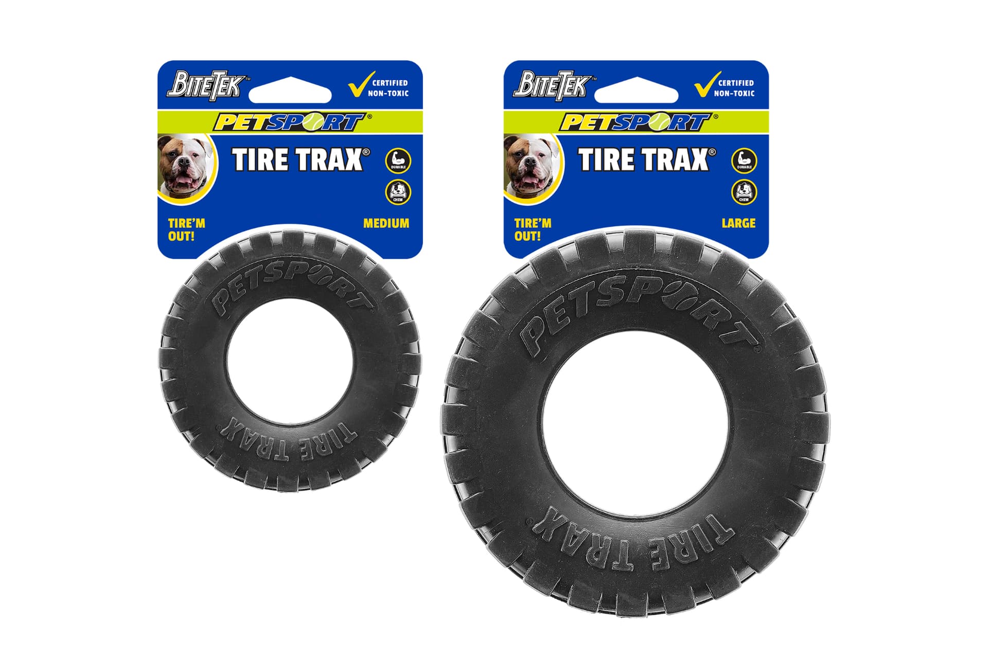 Tire Trax™ besteht aus BiteTek™-Material und ist ein extrem robustes, gummiertes Kauspielzeug mit realistischem Reifenprofil für zusätzliche Griffigkeit und Textur. Erhältlich in 10 cm und 15 cm, hält dieses Spielzeug intensivem Kauen und interaktivem Spielen stand. Tire Trax™ bietet Stabilität, anhaltenden Spielspaß und langanhaltende Unterhaltung.