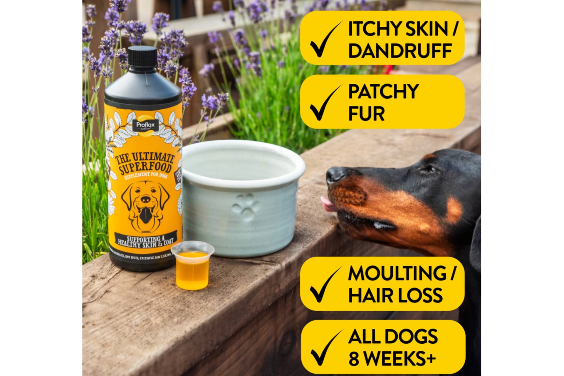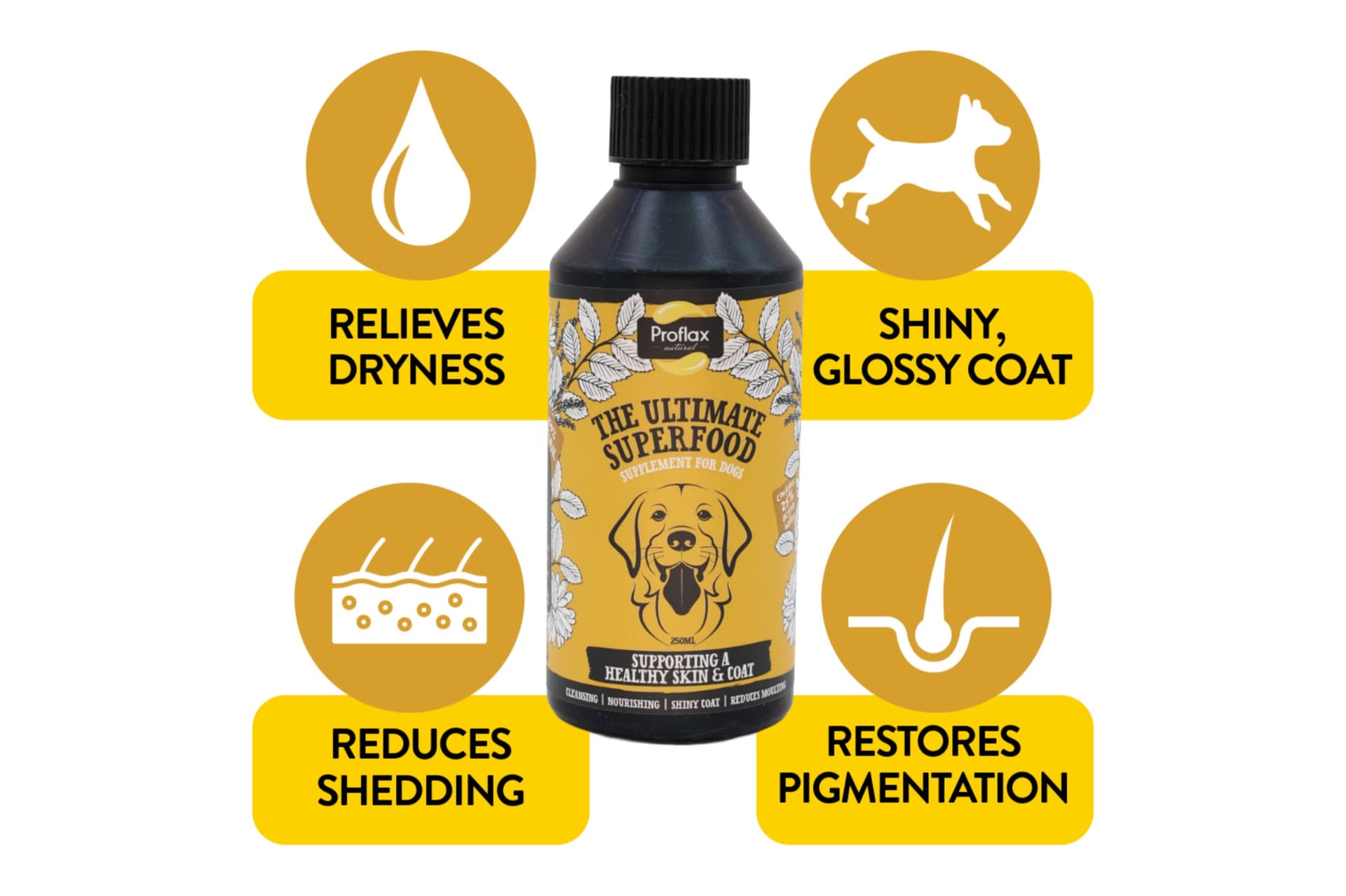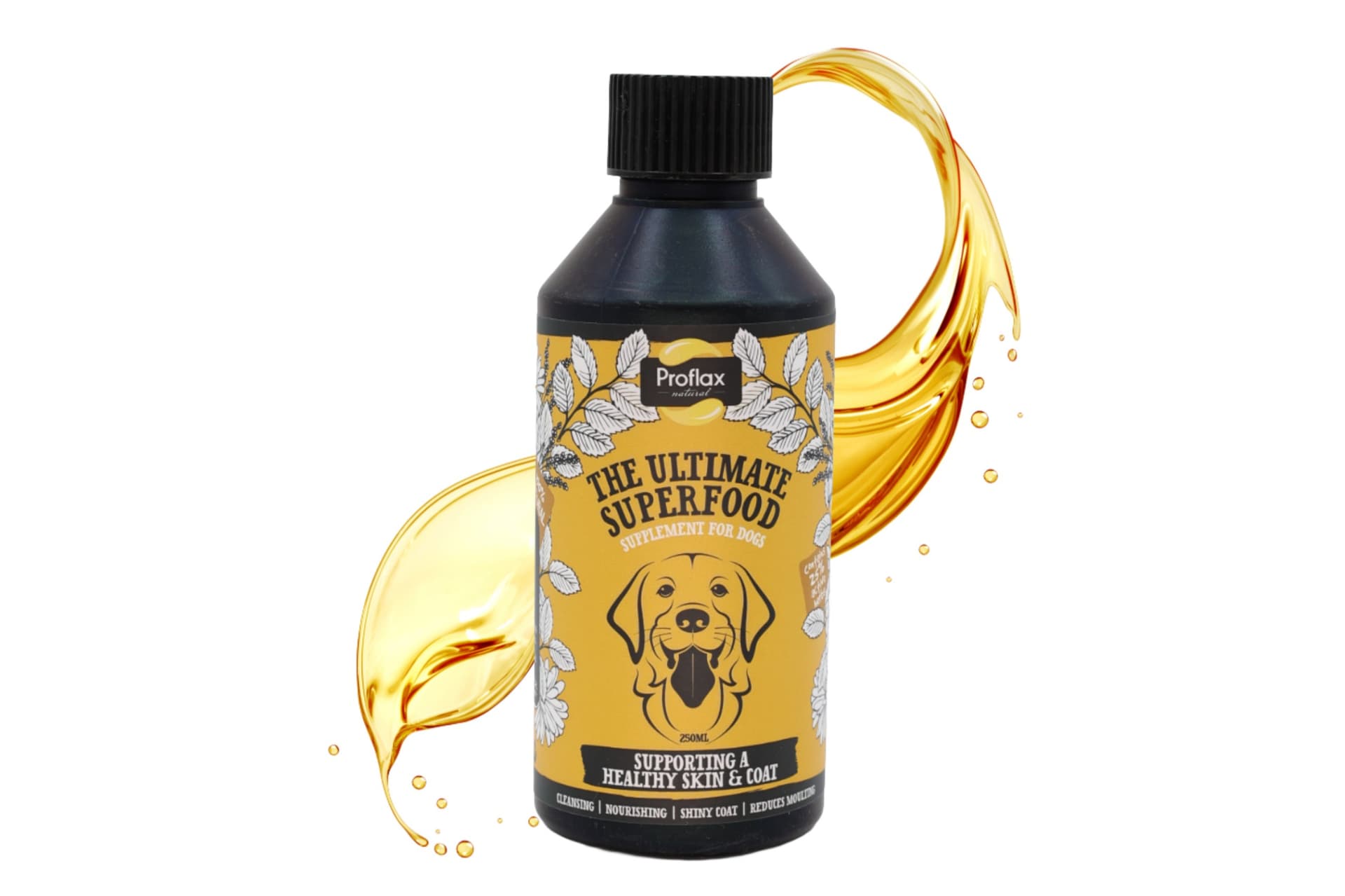 Proflax Skin & Coat ist ein 100% natürliches Hundeergänzungsmittel, das zu gesunder Haut und glänzendem Fell beiträgt. Reich an Omega-3-Fettsäuren und pflanzlichen Inhaltsstoffen, die traditionell zur Unterstützung von Haut und Fellgesundheit eingesetzt werden, ist es ideal für Hunde, die zu saisonalen Veränderungen oder stumpfem Fell neigen.