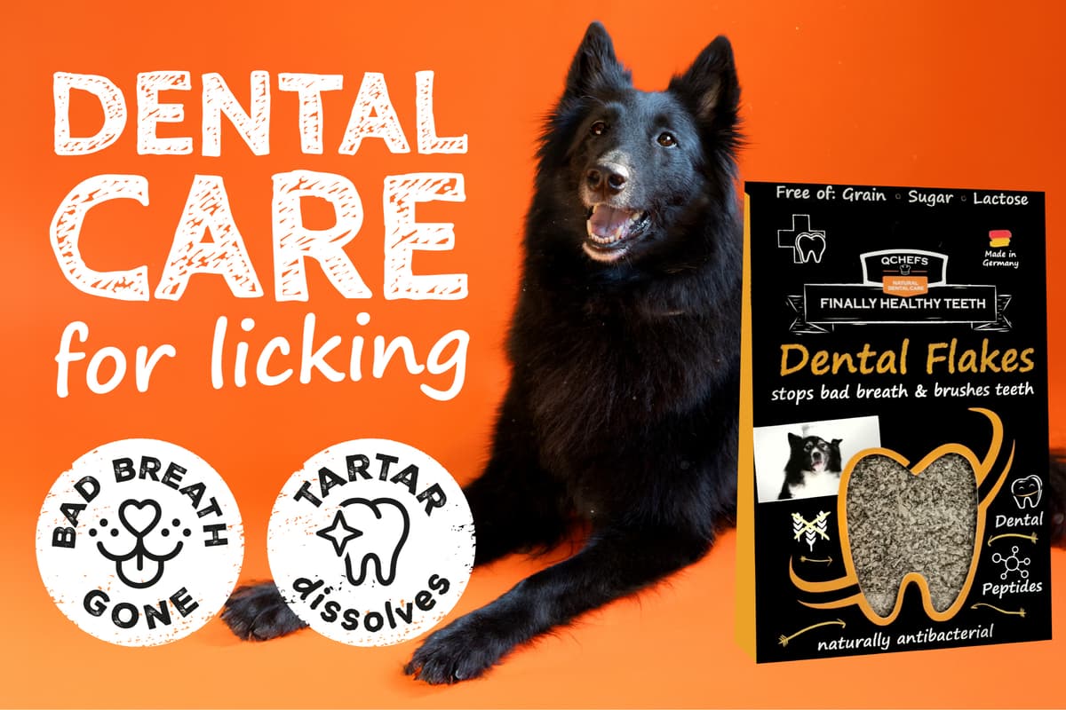 Mit Spaß wird Zahnpflege zum Ritual Ist das Zähne putzen lecker und gesund - wird es vom Tier eingefordert. Ohne Stress und Zeitaufwand wird QCHEFS je nach Vorliebe geschleckt- geknuspert oder geknabbert- mit Zahnputzflocken- Knusperleckerli in allen Größen bis zum steinharten Knabberknochen.