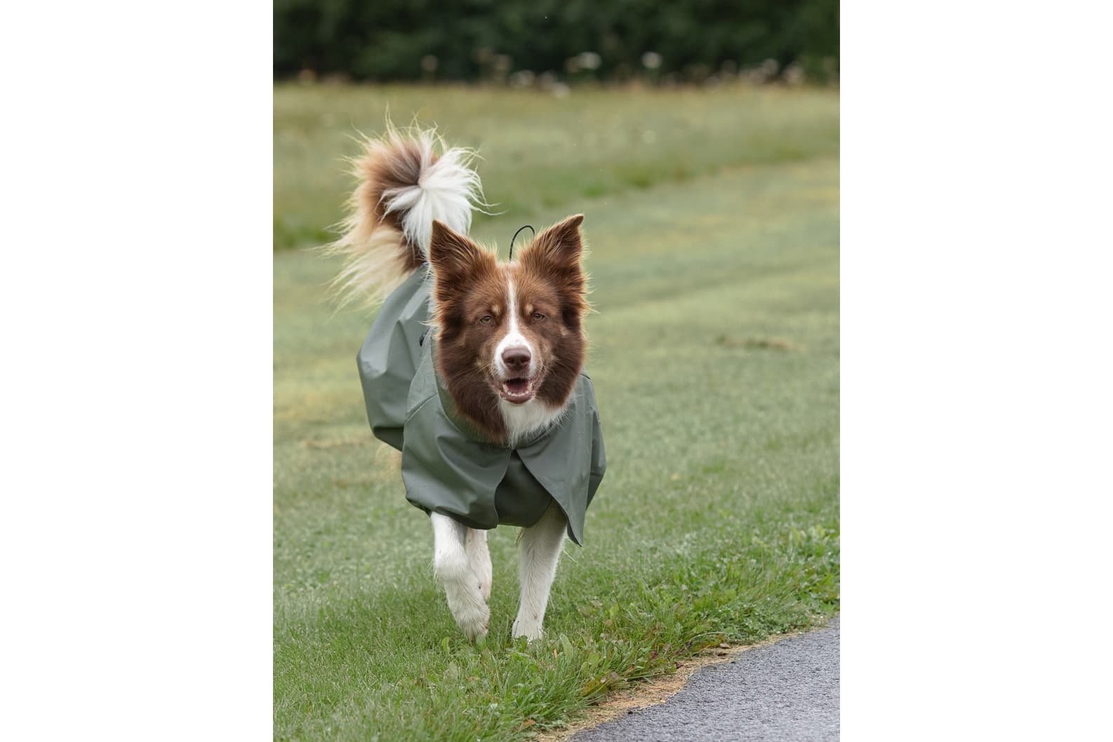 Der Regenmantel kann für eine perfekte Passform mit elastischen Bändern am Schwanz und Kopf sowie dem verstellbaren Gurt um den Körper angepasst werden. Der umklappbare Kragen bietet zusätzlichen Schutz, während das weiche Innenfutter an nassen und windigen Tagen Komfort bietet.