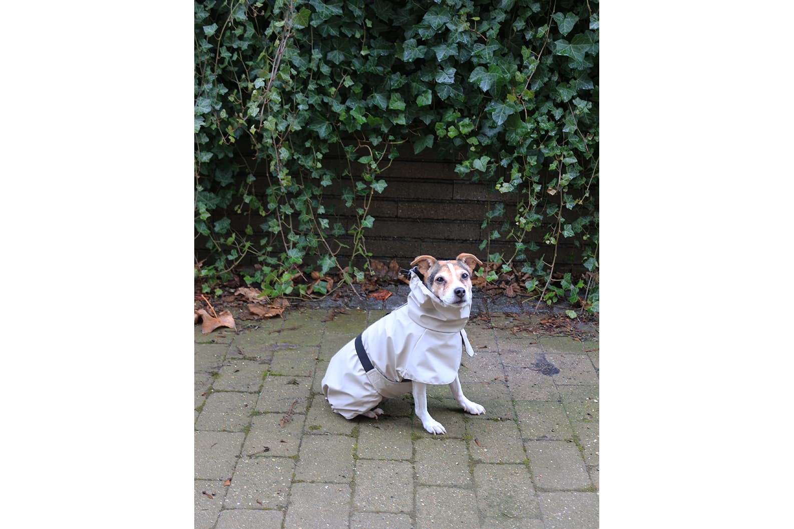 Der Regenmantel verfügt außerdem überflache elastische Beinschlaufen, durch die die Hinterbeine geführt werden, um den Mantel bei Wind an Ort und Stelle zu halten (nicht in Größe 30 und 50). Die Schlaufen sindleicht abzuschneiden, wenn Sie sie nicht verwenden mö ...