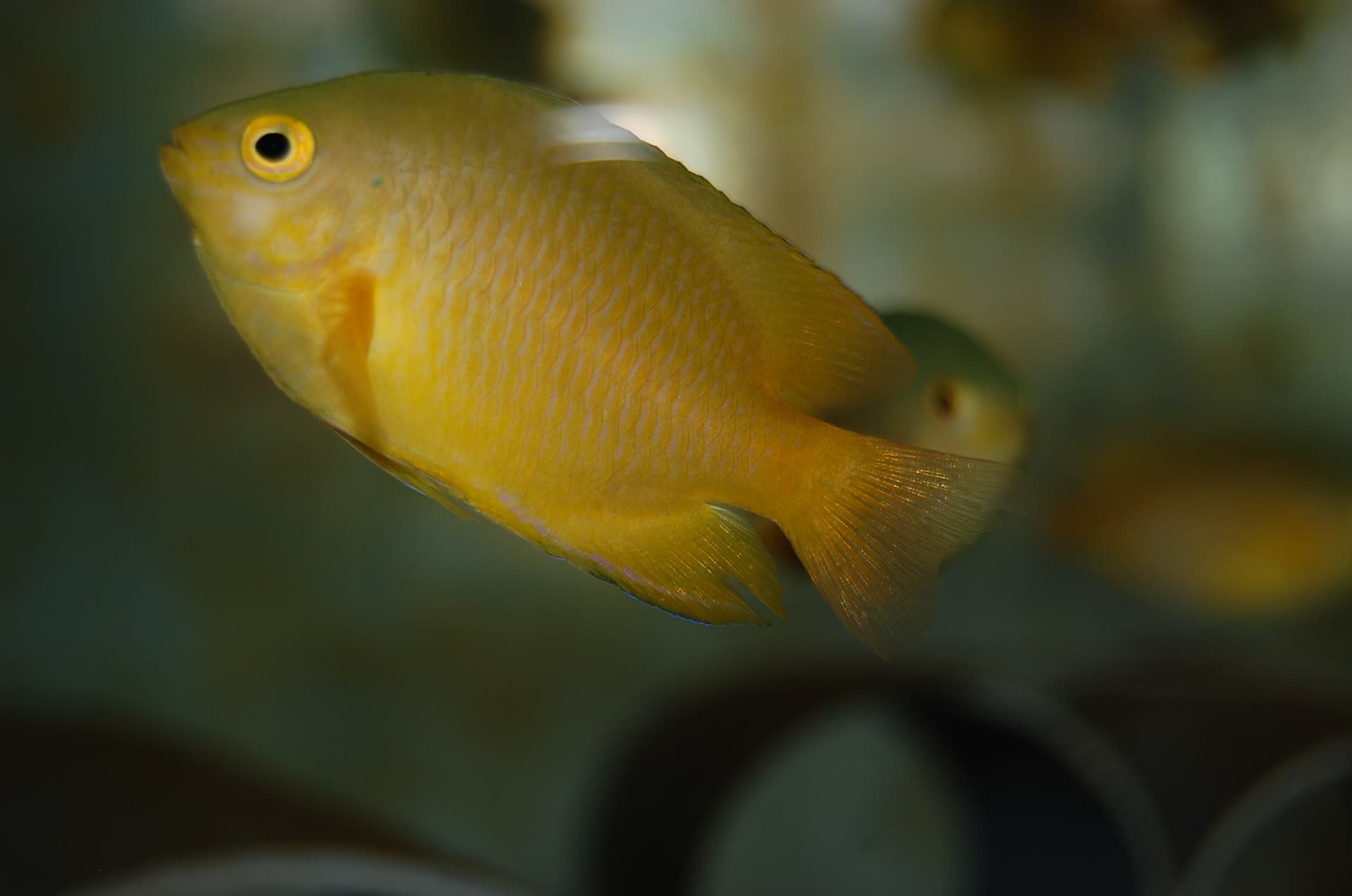 The Maluku damselfish has a bright lemon-yellow body, making it a popular ornamental fish. It mainly inhabits clear, sheltered lagoons, rubble and coral areas, and the subtidal zone. Usually seen in groups, it is a species valued for both display and research purposes.