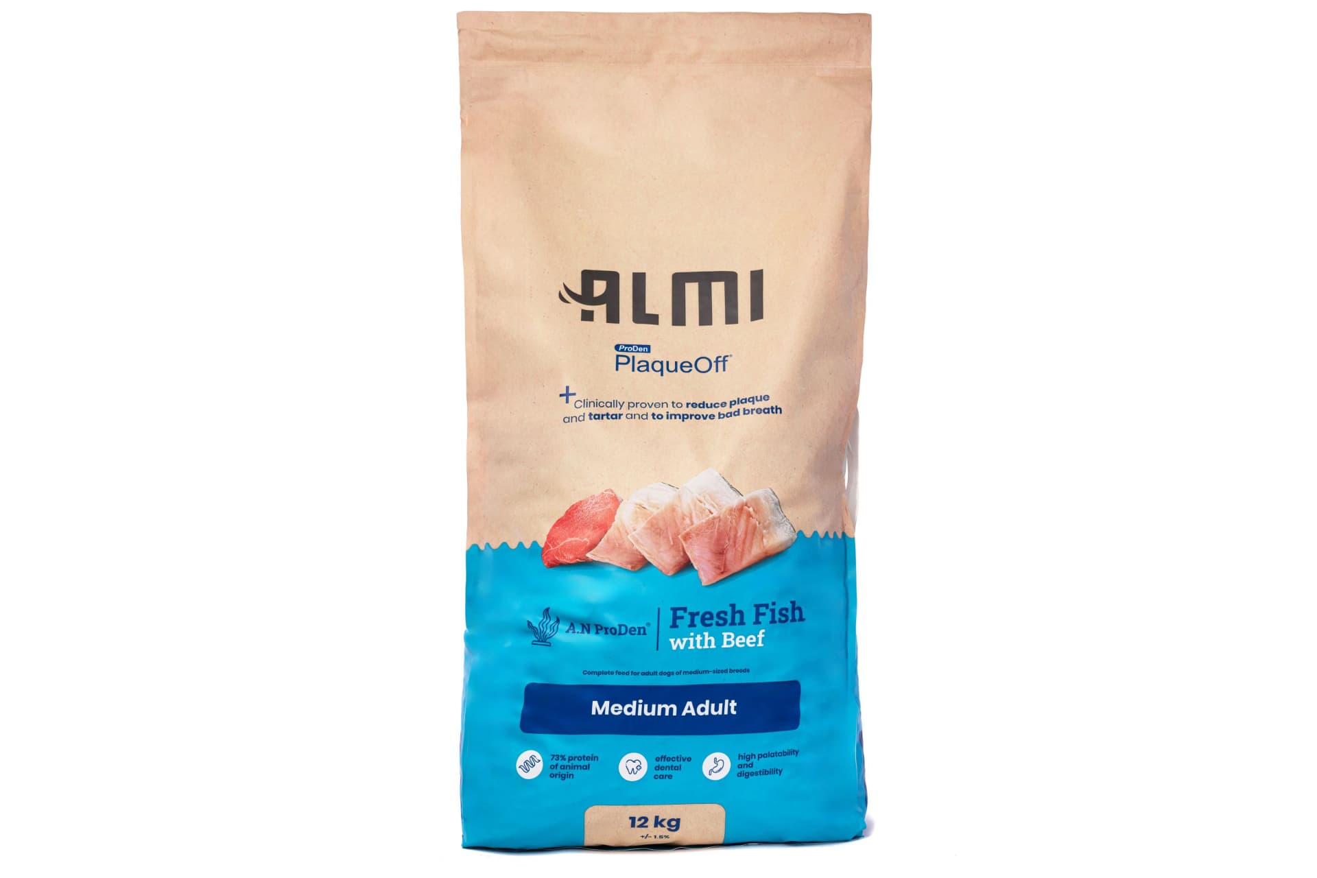 ALMI dry dog food features a high proportion of fresh fish and beef. Nurture your dog with a balanced and nutritious diet rich in protein and fat for lean muscles and healthy skin and coat. It also contains rice for easy digestion. The rice is gluten-free, which makes the formula suitable for sensitive dogs.