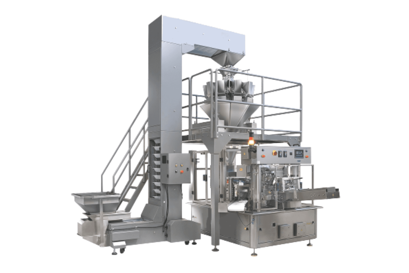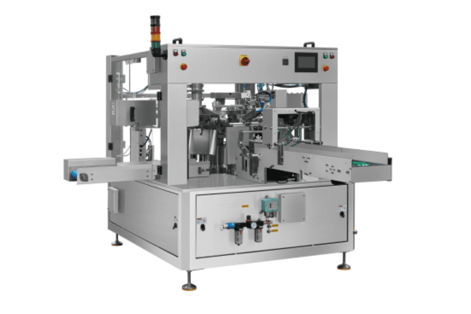 - 8-station rotary filling and sealing machine for high-speed output up to 80 pouches/minute