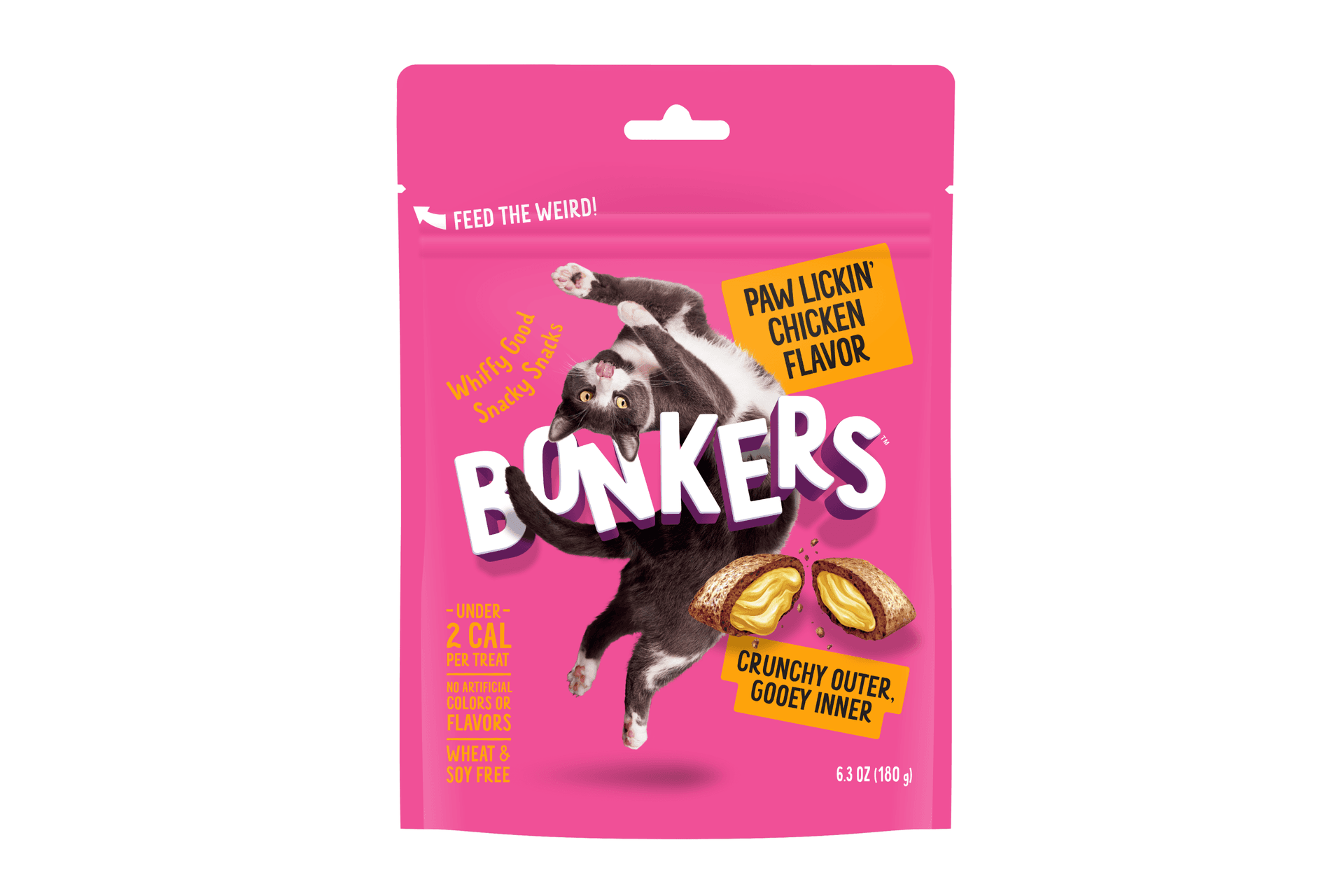 BONKERS cat bites have a crunchy outer layer and irresistibly gooey center, delivering a texture and taste combination that even the pickiest of cats will go bonkers for. Created in collaboration with leading animal nutritionists, BONKERS’ carefully formulated recipes are made up of high-quality proteins and are free from wheat, soy, artificial colors and flavors, so you can feel good about treating your cat. Whether it's time spent bonding with your cat, in-between meal snacks, or playtime, we’ve spent a long time perfecting these treats and are confident they will drive your pet completely, utterly BONKERS!