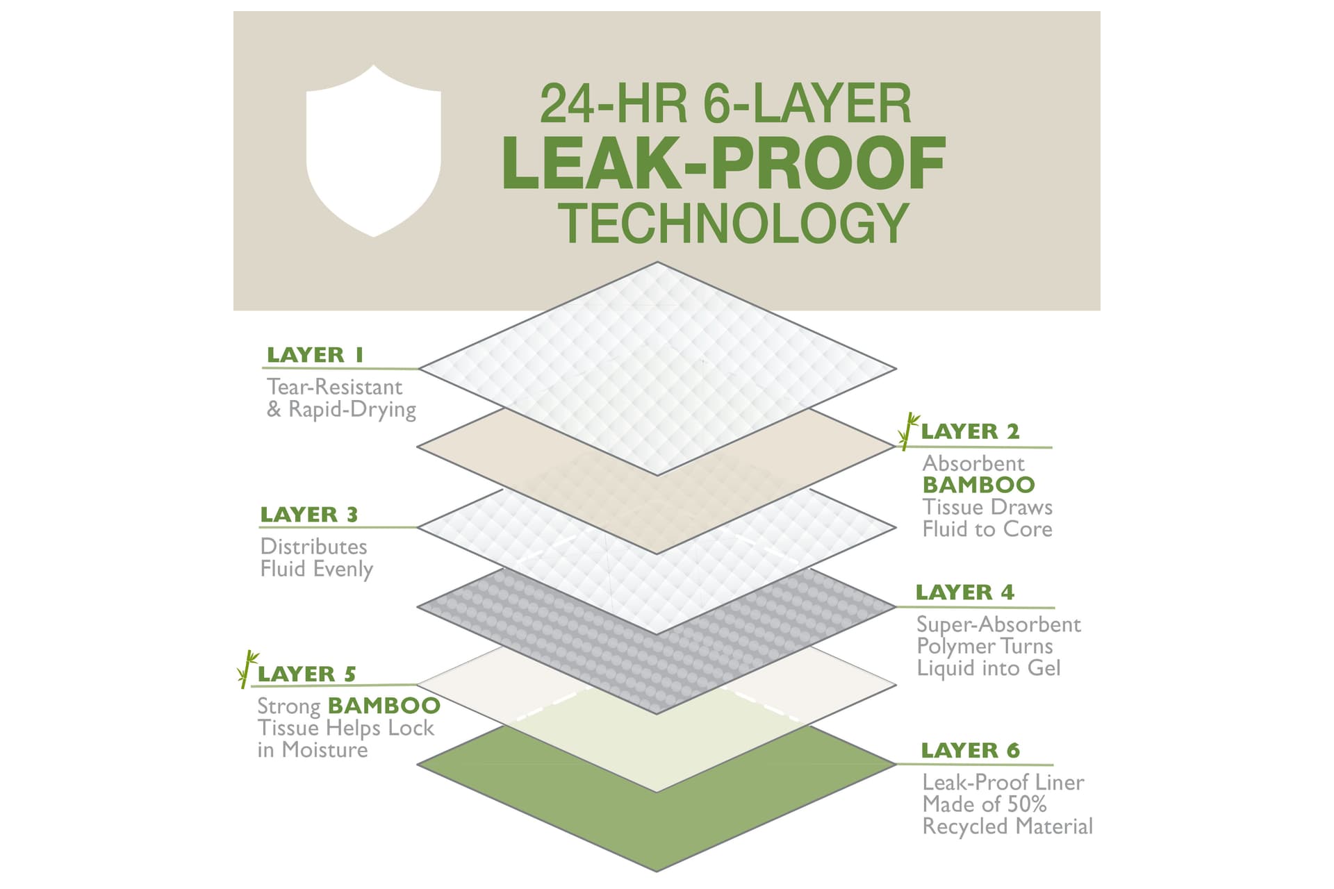- Leak-proof liner made from 50% recycled material and top layers made with bleach-free, dye-free tissue
