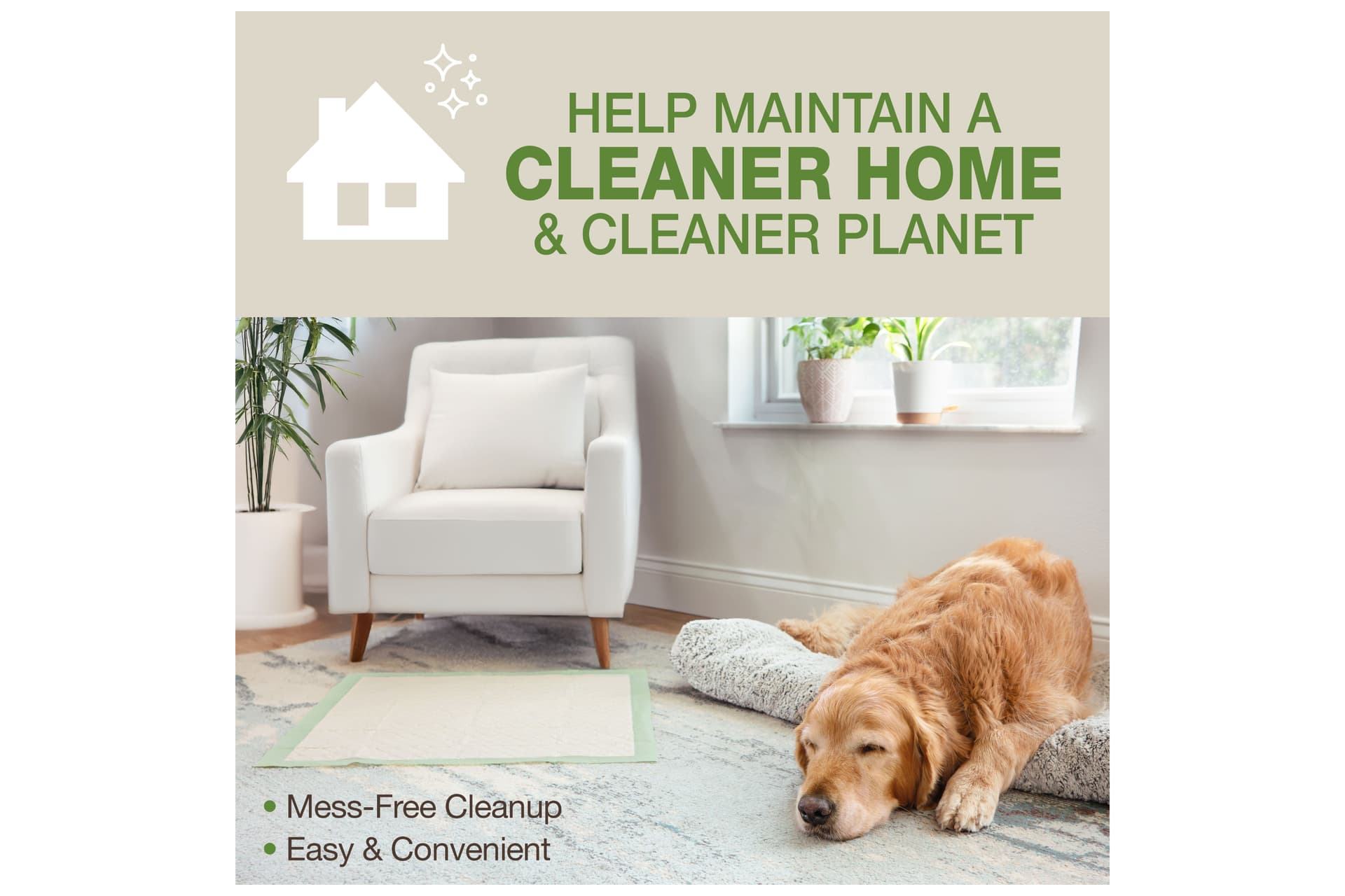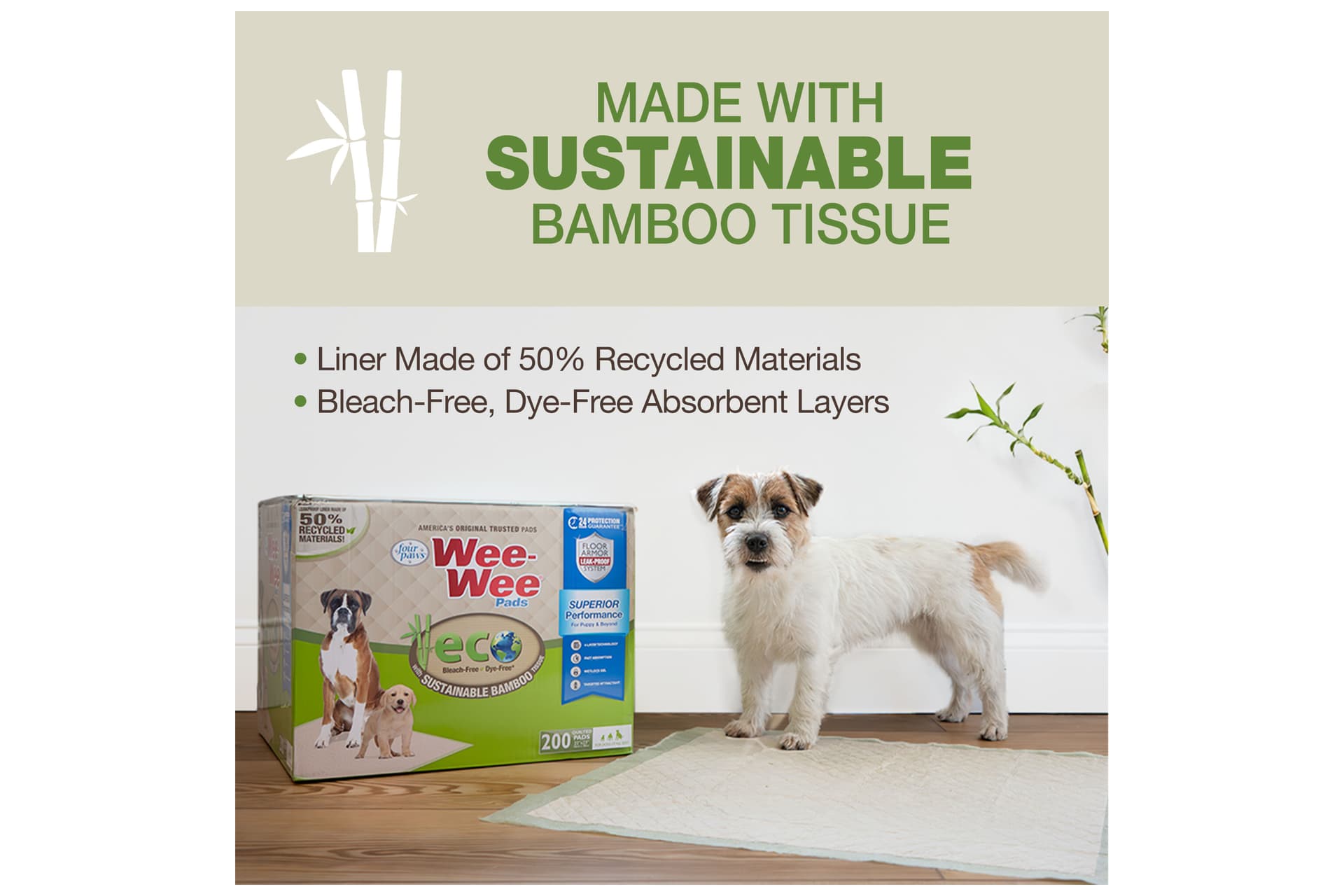 Wee-Wee® Superior Performance Eco Pads feature Earth-friendly materials and proven dependability. These dog pee pads are made with FSC-certified sustainable bamboo, a renewable resource that helps minimize odors and is stronger than traditional paper products. Each pad also offers absorbent bleach-free & dye-free layers, a leak-proof liner made of 50% recycled materials, and 24-hour protection for a cleaner home—and a cleaner planet! Plus, they're designed with our signature Floor Armor Leak-Proof System to keep floors dry and targeted attractant to draw your dog to the pad. As part of our Earth-friendly mission, these pee pads with bamboo are made with renewable, ethically sourced materials and come in smarter, compact packaging for less pollution and a smaller carbon pawprint ...