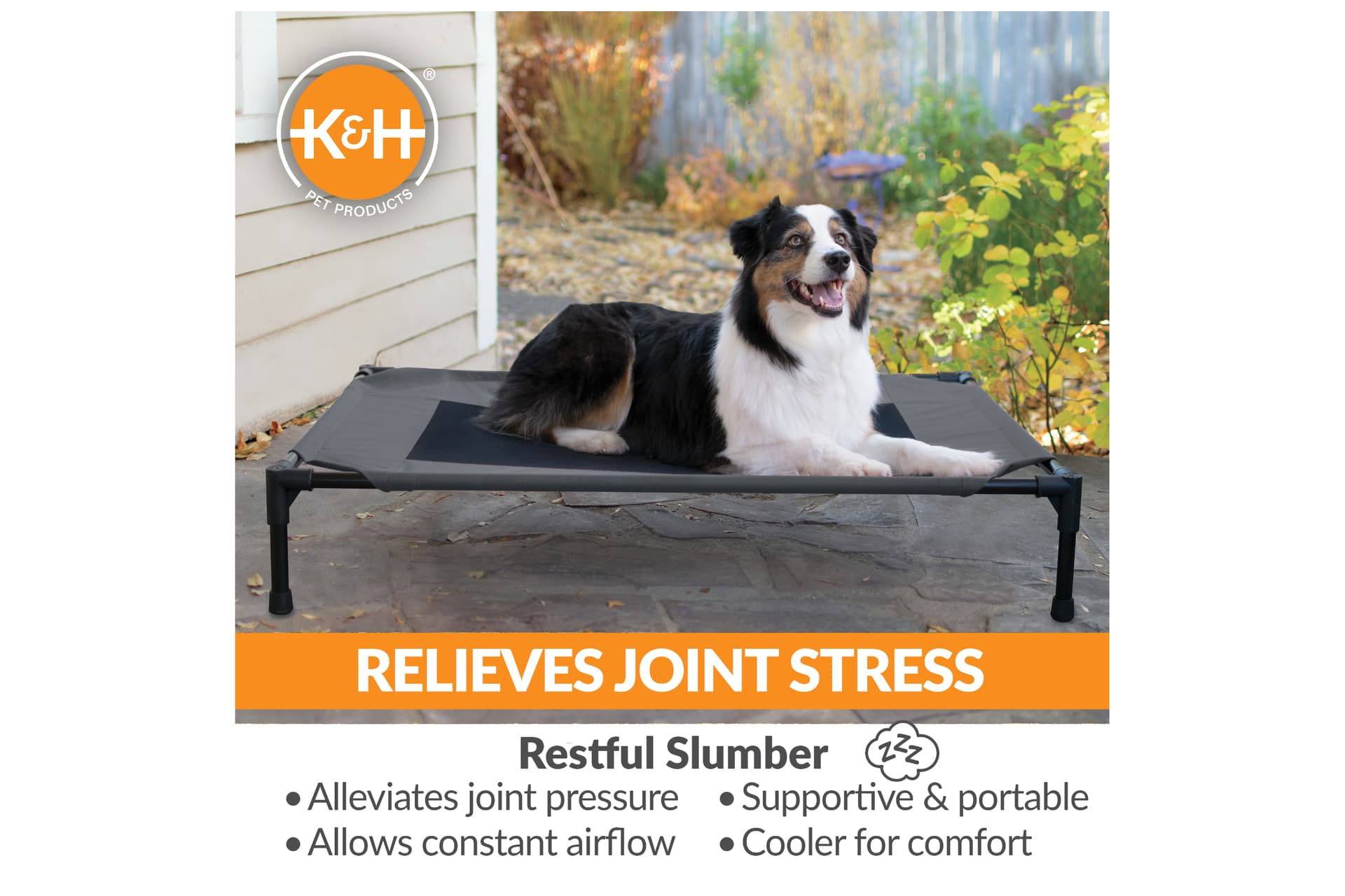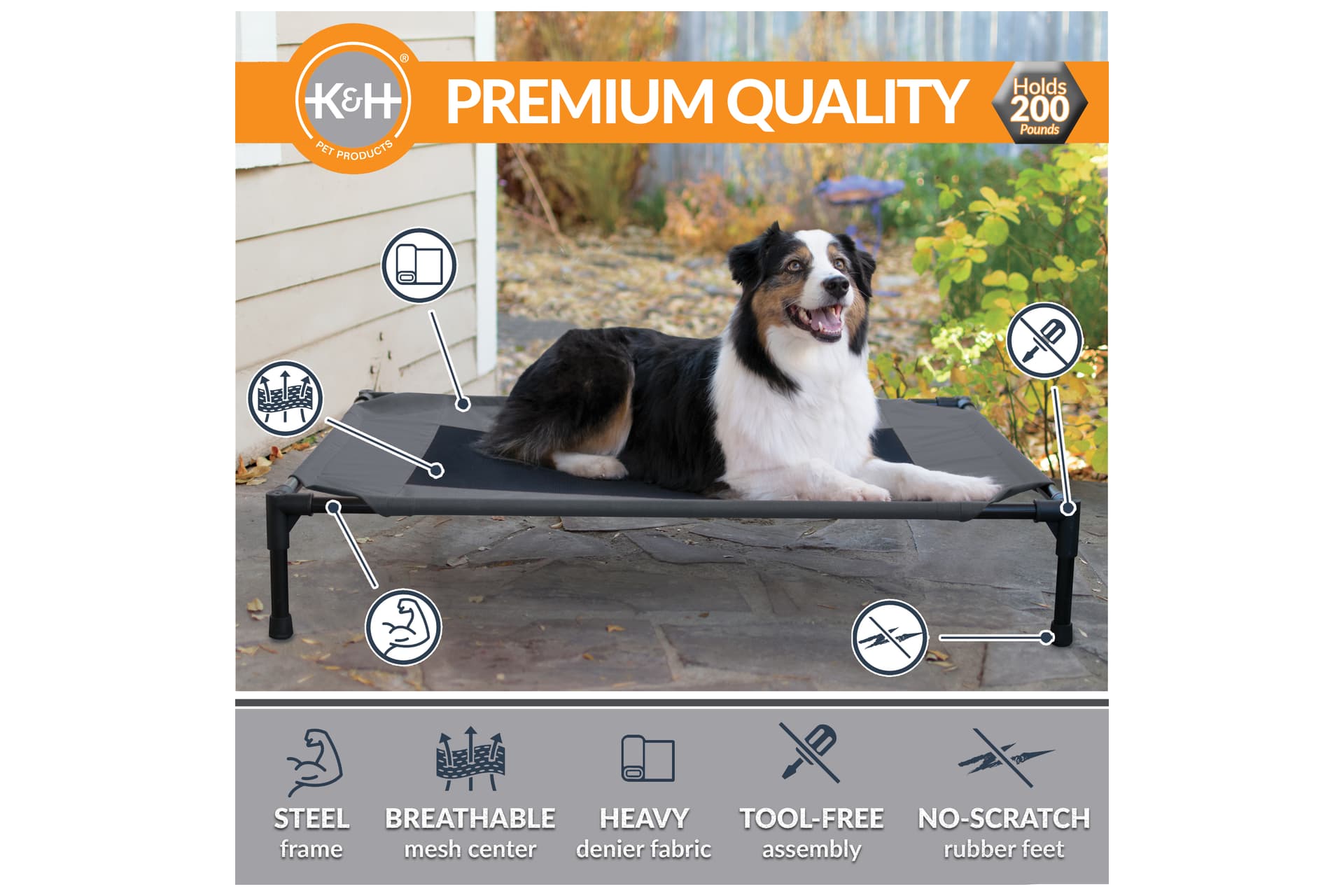 The K&H Pet Products Pet Cot raised dog bed keeps your dog elevated and off the ground allowing air to flow around your pet to keep them cool. The easy to assemble elevated pet bed requires no tools! Can be disassembled and taken anywhere. Our raised dog bed is great for camping, hiking, picnics, or anywhere at home inside or out. Made with water-resistant, heavy denier fabric and a breathable mesh center that repels moisture. The cover is removable and washable or can be hosed off outdoors.