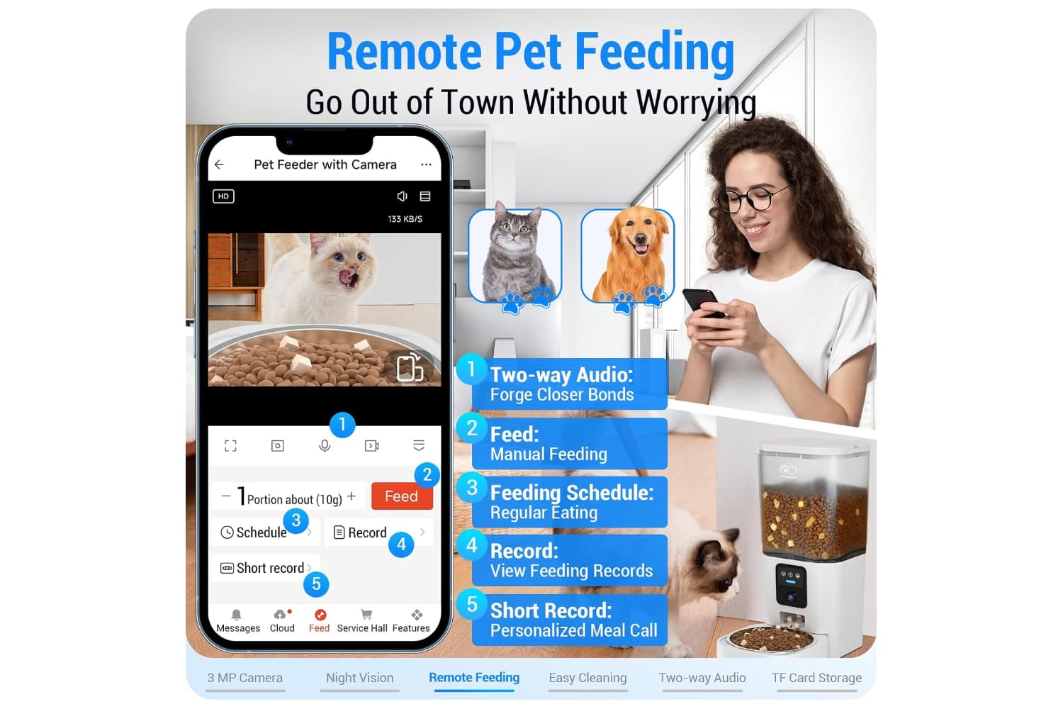 Go Out of Town Without Worrying : When you are traveling, attending a party or up too late to feed your pet at home, smart automatic cat feeder will regularly schedule your pet's daily food for you. No matter where you are, you can monitor your pet's daily routine and diet, as well as change your feeding schedule online, anytime, anywhere via the mobile app.