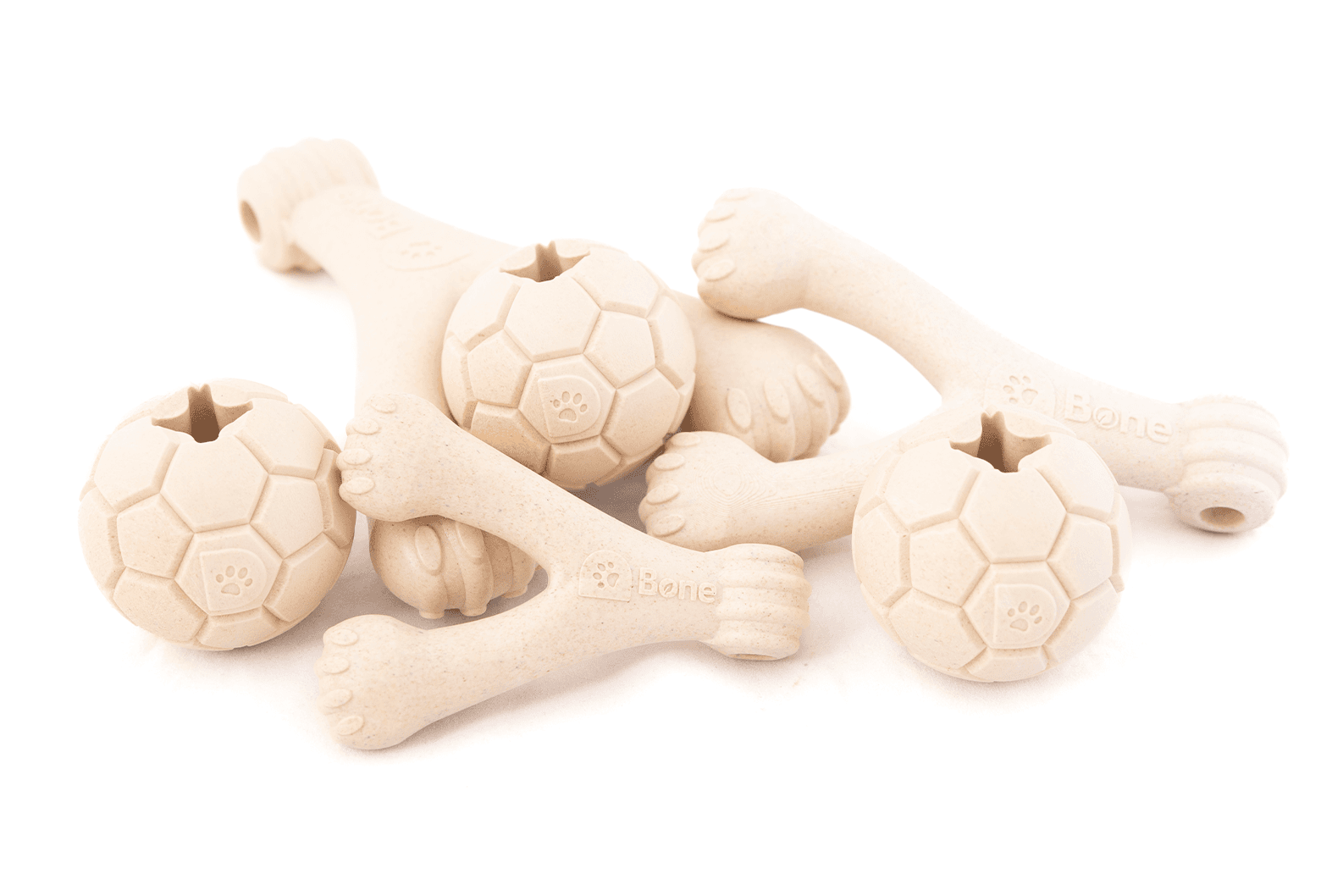 The D-Bone Chew Ball is made from Naturion™, a proprietary plant-based material designed to replace nylon and fossil-based plastics in everyday pet products.