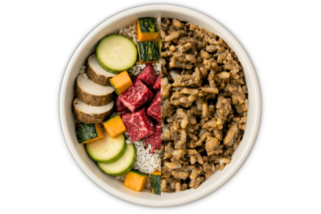 Beef: Beef heart, beef liver, pumpkin, zucchini, parboiled rice, cassava, oat bran, canola oil, calcite, dicalcium phosphate, xanthan gum, salt, water, spirulina, and mineral and vitamin supplements.