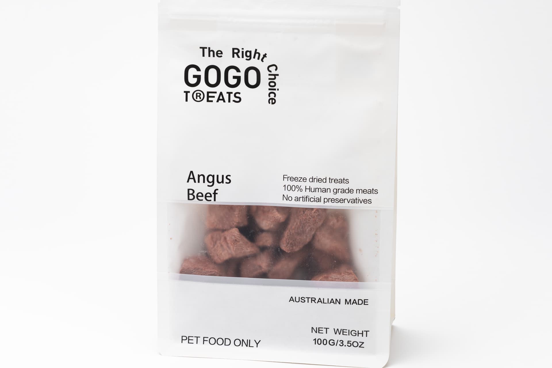 Gogo Treats Freeze-Dried Angus Beef. One ingredient: 100% Australian Angus beef. No additives, no fillers, no shortcuts. Cut from human-grade Angus beef and freeze-dried at our Melbourne facility to keep the protein, flavour, and nutrients exactly as they should be.