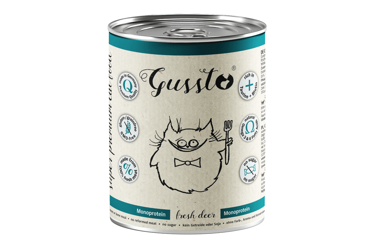 Gussto a complete and perfectly balanced grain free super-premium food for cats.It is produced to an equivalent human food standard from the highest quality meat and is perfectly complimented with nutritional additives. Gussto - the essence of good and healthy nutrition. For sale only in good pet stores.