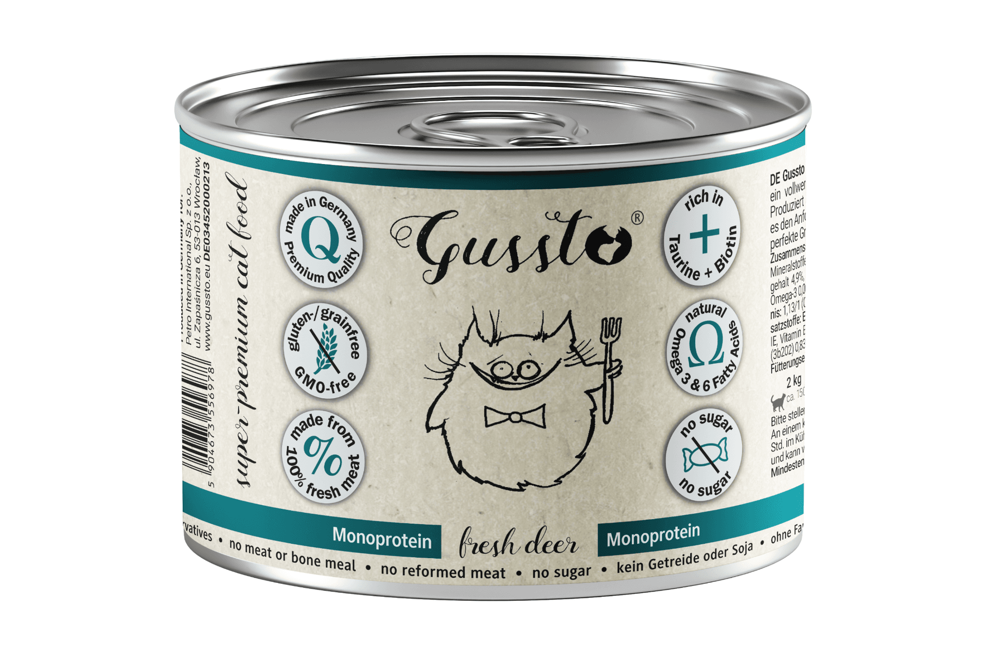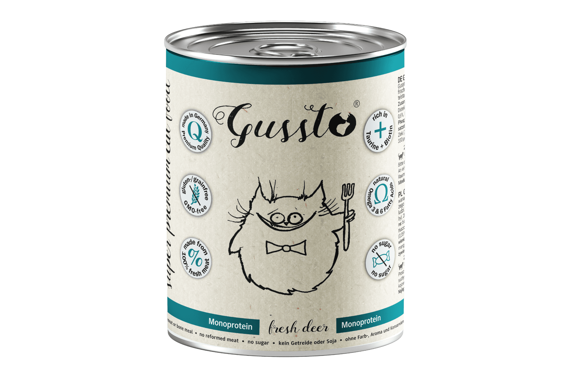 A complete and perfectly balanced super-premium cat food, crafted exclusively from high-quality meat and produced to standards comparable to those of human-grade food. This is an easily digestible and highly bioavailable food, thanks to its high content of premium venison. The balanced calcium/phosphorus ratio helps minimize the risk of urinary and kidney diseases. Gussto food is rich in taurine and biotin, which strengthen the cats’ skin, coat, and circulatory system. It also contains milk thistle oil, known for its anti-inflammatory properties.
