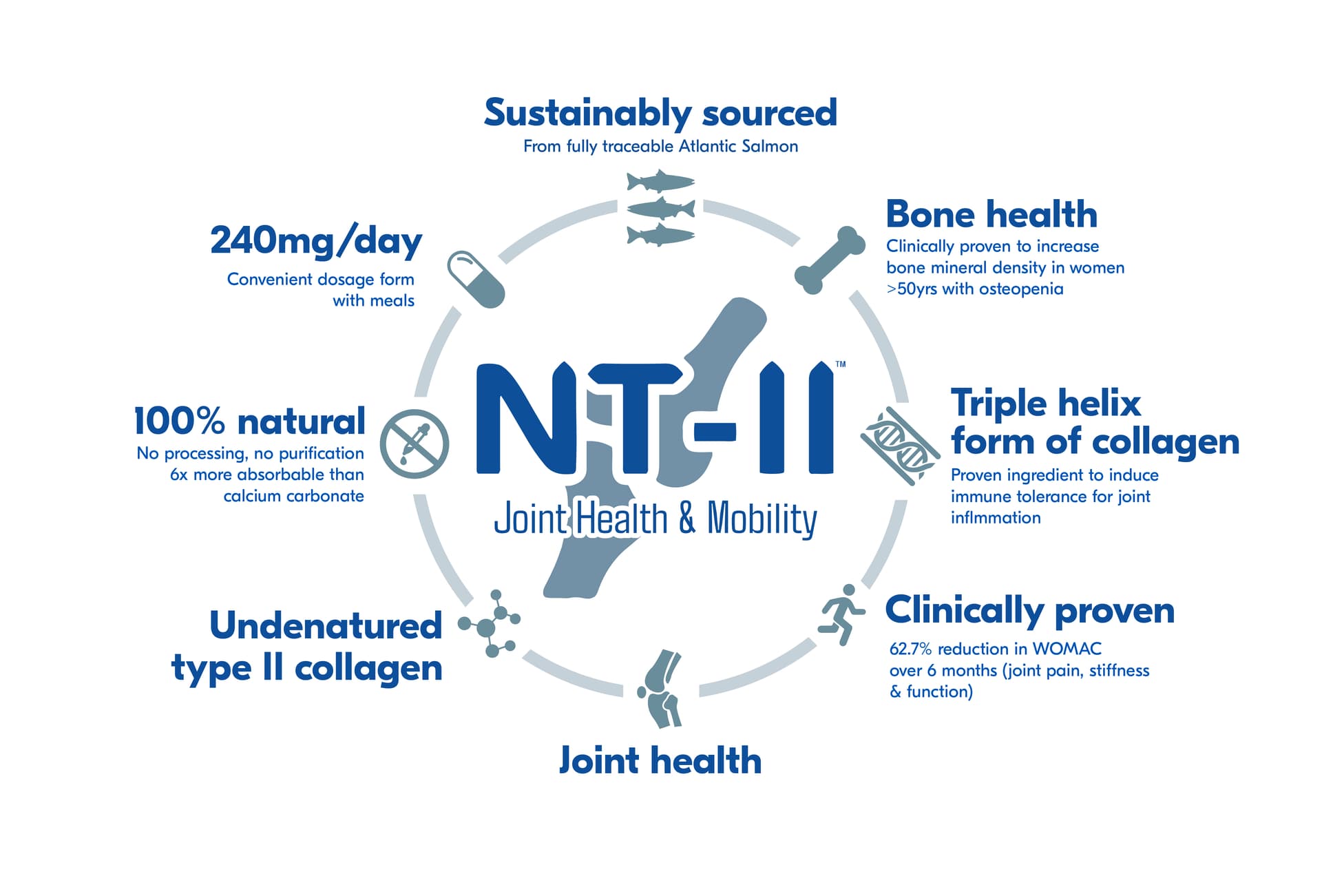 NT-II™ is a natural, undenatured Type II collagen derived from the off-cuts of fresh, sustainable Norwegian Atlantic salmon. Produced through a proprietary, low-temperature process, NT-II™ preserves the triple helix collagen structure within a protective Calcium Hydroxyapatite scaffold — a unique composition that delivers two clinically relevant health claims in a single ingredient: joint mobility and bone health.