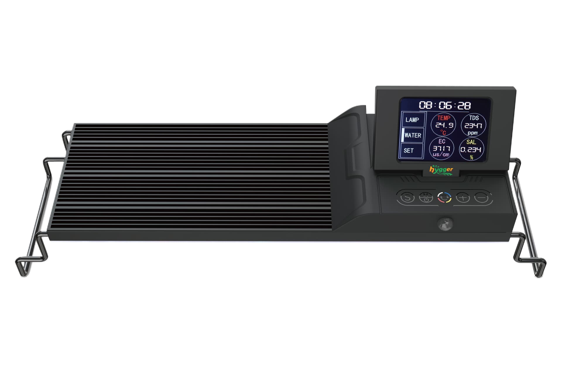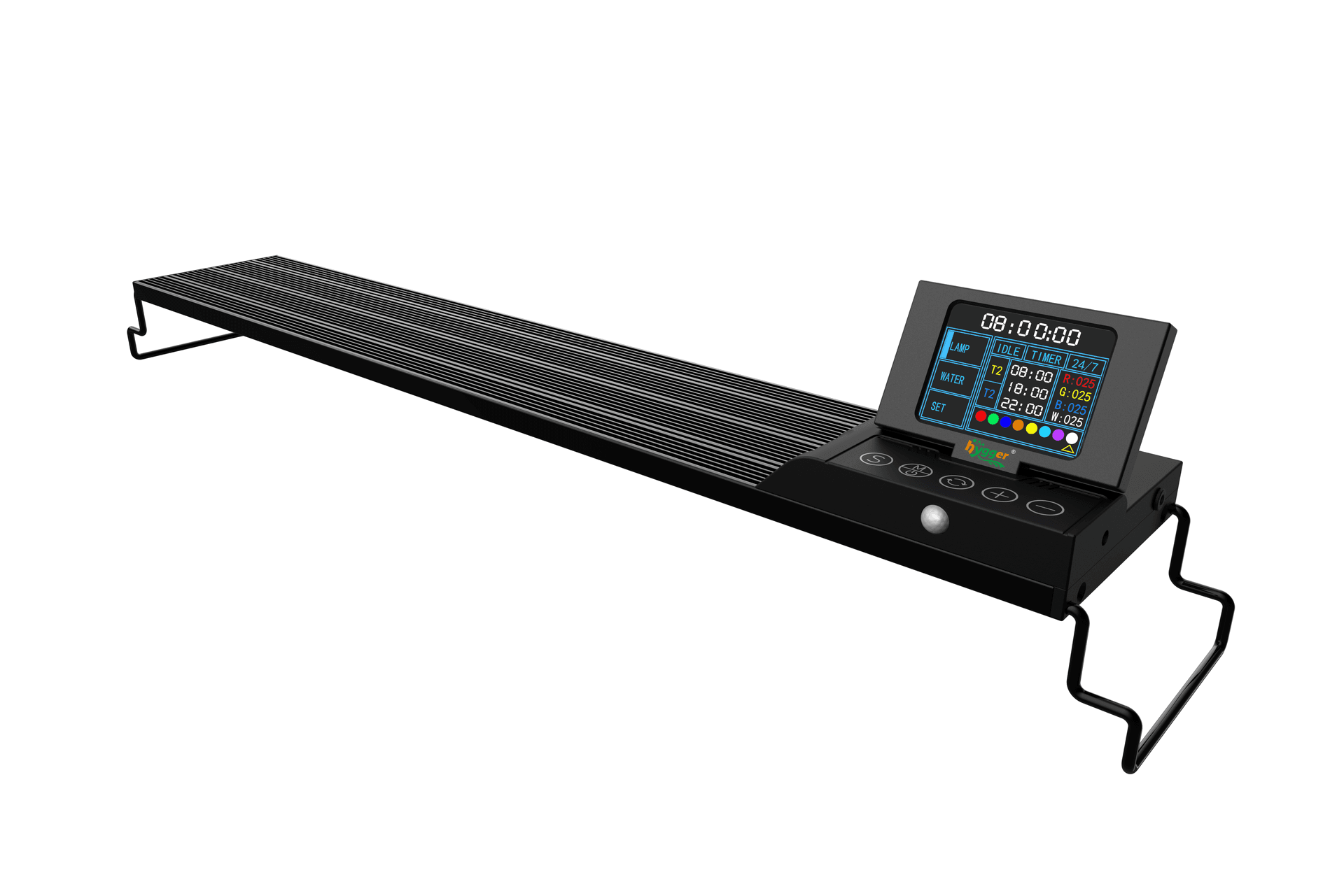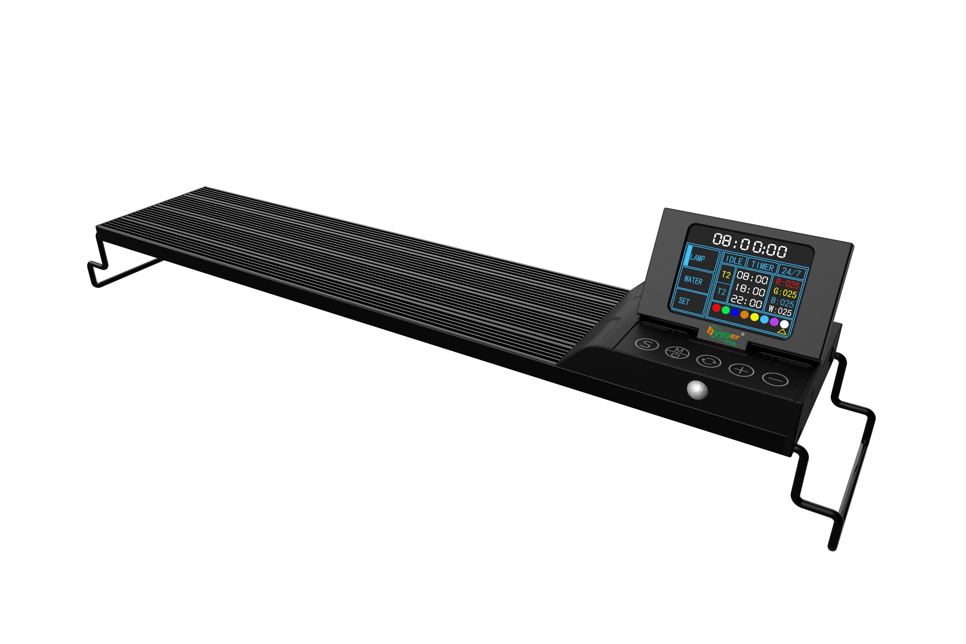 Lighting Control: Users can set and switch lighting parameters and timing modesvia a 24*32mm TFT display and touch keys. The hygger LED light hasten brightness levels and eight different colors (Red, Green, Blue, Orange, Yellow,Cyan, Purple, White), and four color channels (Red, Green, Blue, White). Colorbrightness can be adjusted to support different lighting needs and applications.