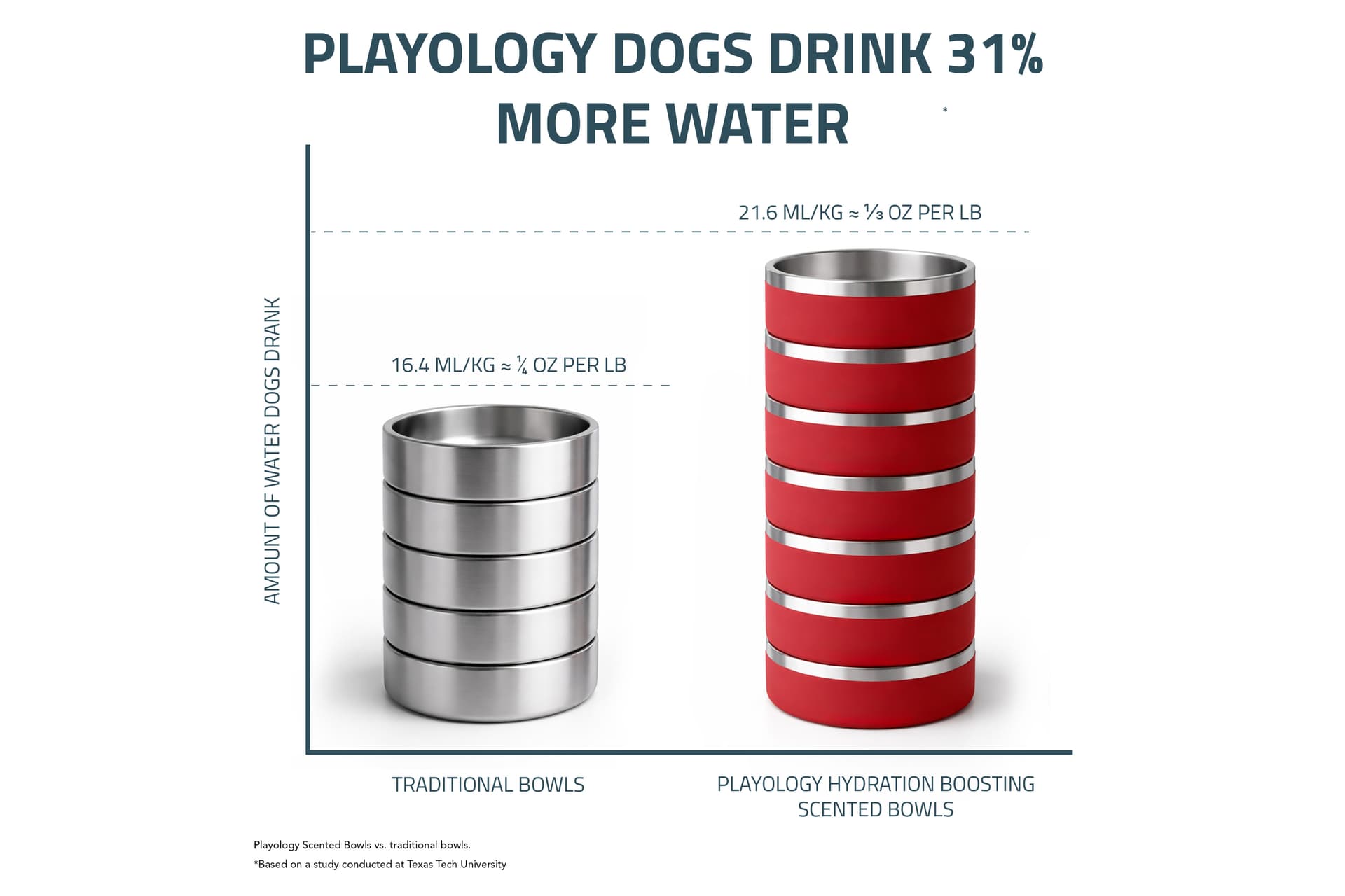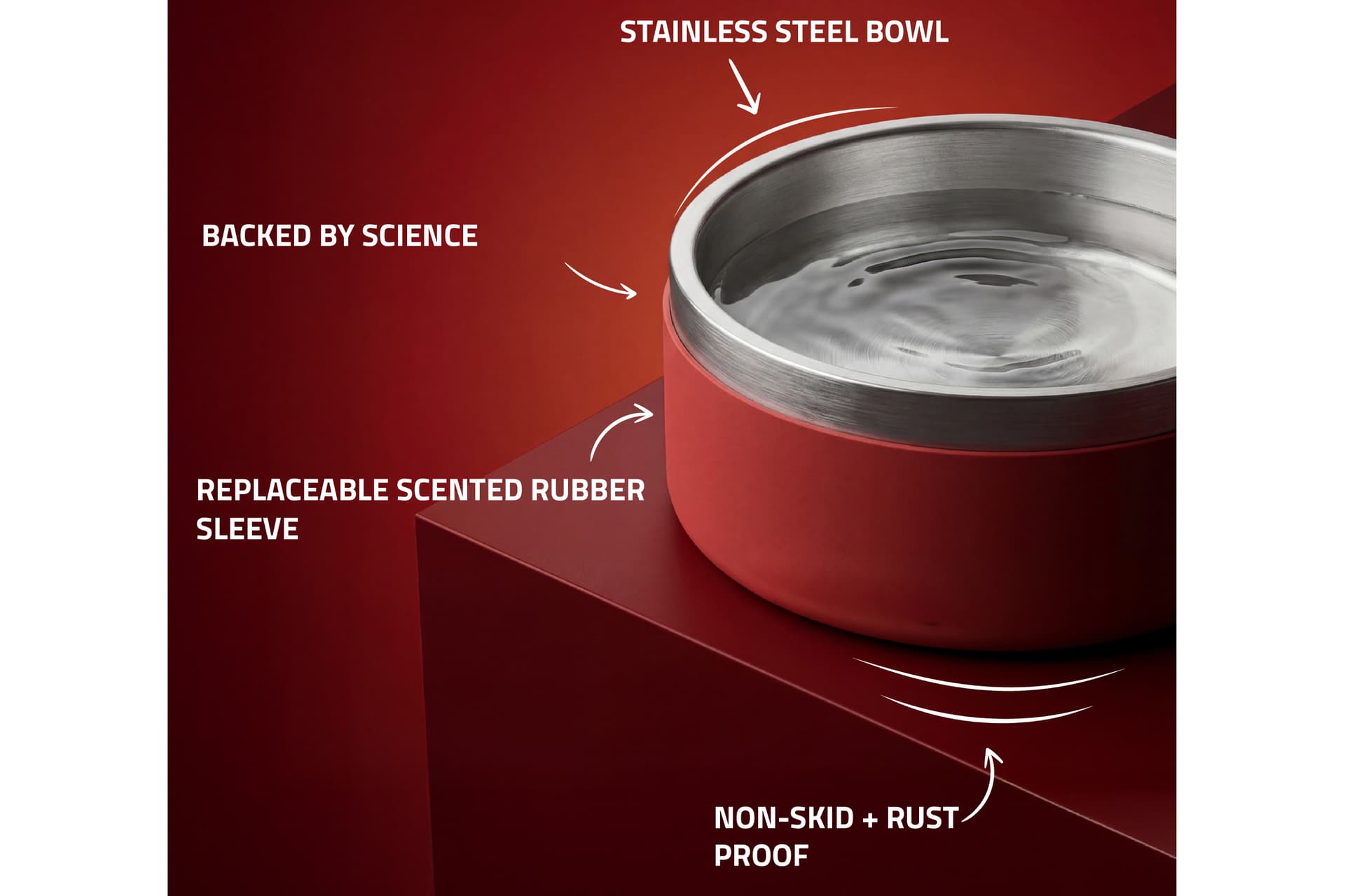 Our Scented Bowls are revolutionary in function without making life more complicated. We paired 100% stainless-steel construction with all-natural rubber scented sleeves to create drinking bowls that are proven to increase hydration by up to 31% versus regular bowls. There is nothing to add to the water - the scented sleeve does the work!
