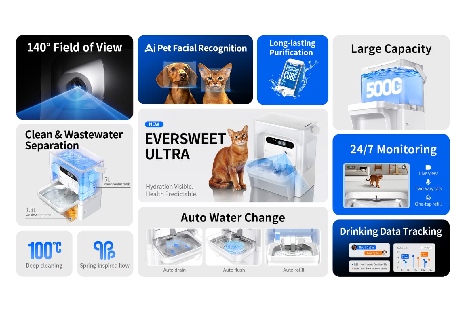 - AI-Powered Hydration Insights for Every Pet. With an AI camera featuring facial recognition, the fountain monitors each pet's real-time drinking activity and tracks their drinking history, enabling personalized urinary health monitoring in multi-pet homes.