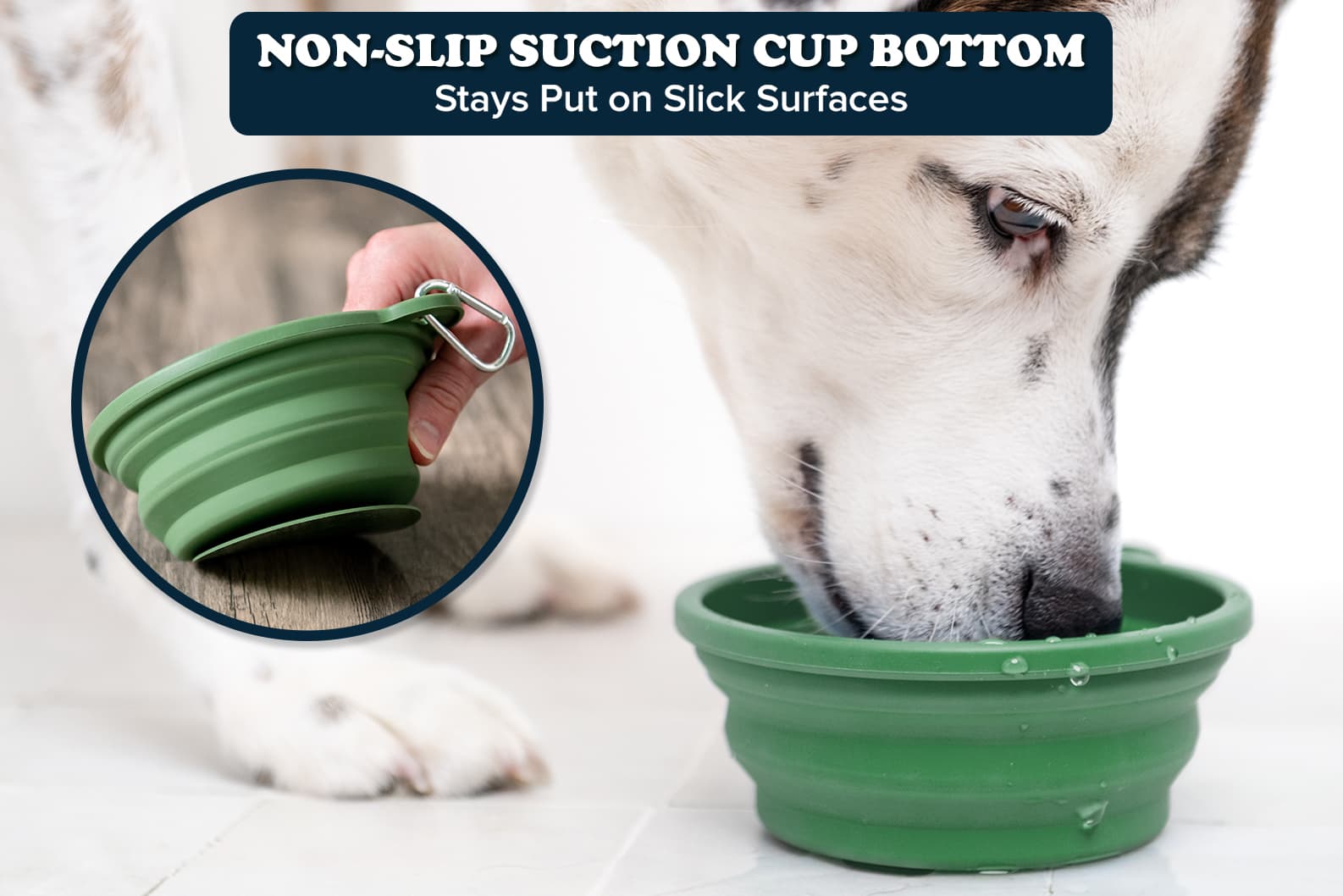 - The non-slip suction cup bottom keeps the bowl securely in place, preventing sliding and spills on any surface. Lightweight and collapsible for easy storage, with a built-in clip to attach to your bag, leash, or belt loop.