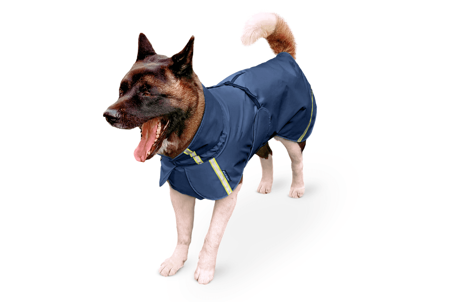 The Stormy offers even more coverage on the belly and hind legs, and the adjustable back and chest ensure a perfect fit. Both the length and collar can be adjusted for added comfort. The Stormy also has a zipper on the back for attaching a leash or harness. Reflective stripes provide extra visibility during evening walks. The Stormy raincoat offers protection and style, whatever the weather!