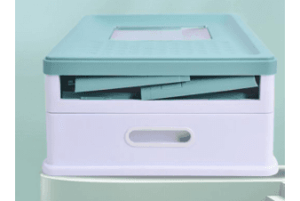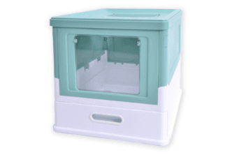 Foldable litter box with easy setup and space-saving storage; features dual doors to contain odors and prevent litter scatter.
